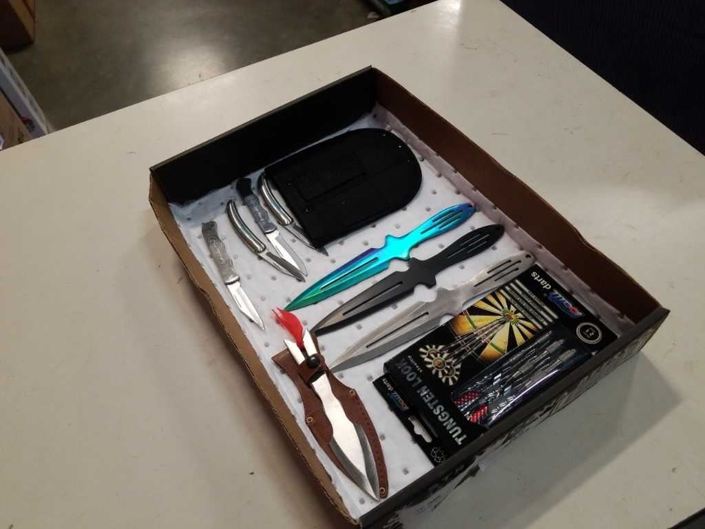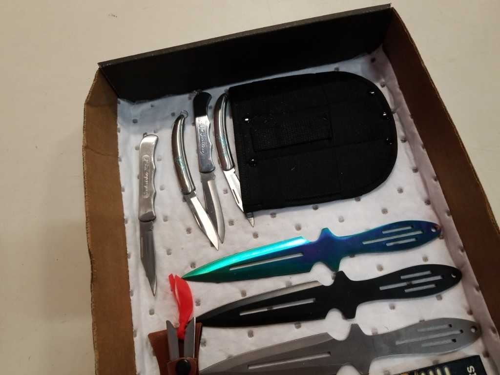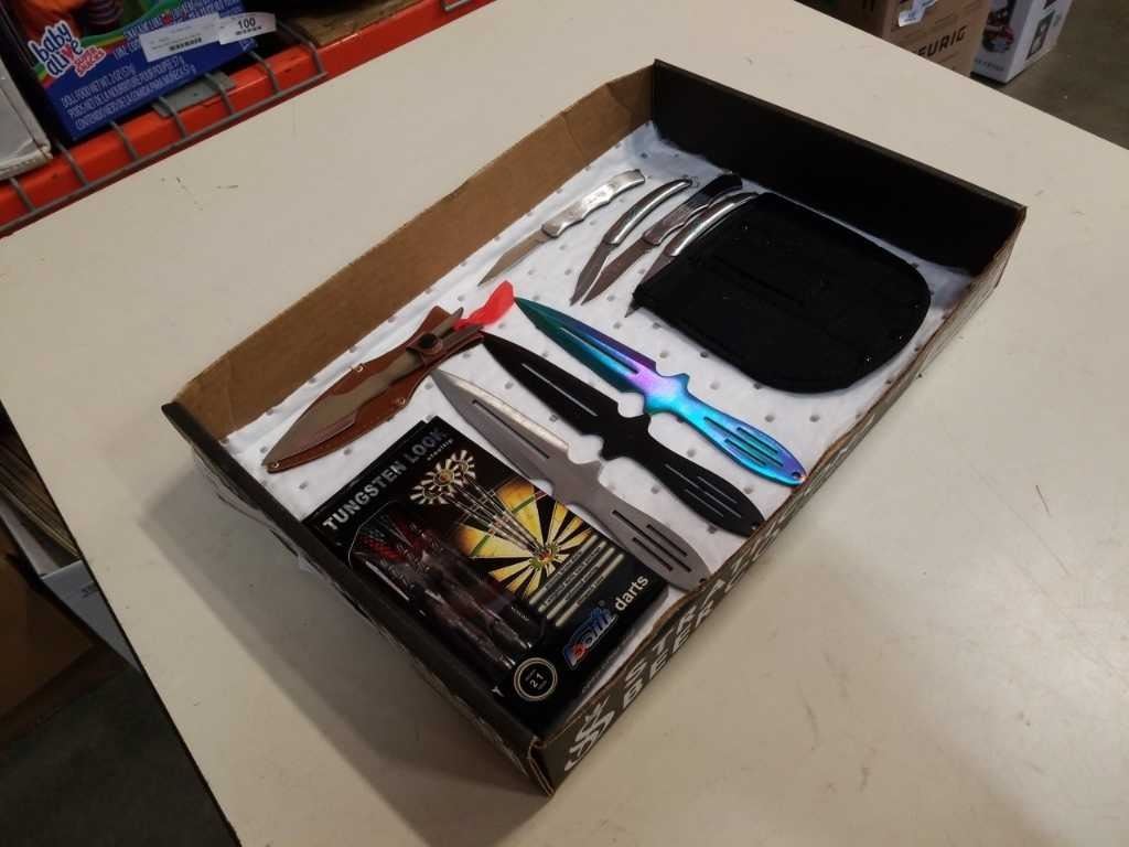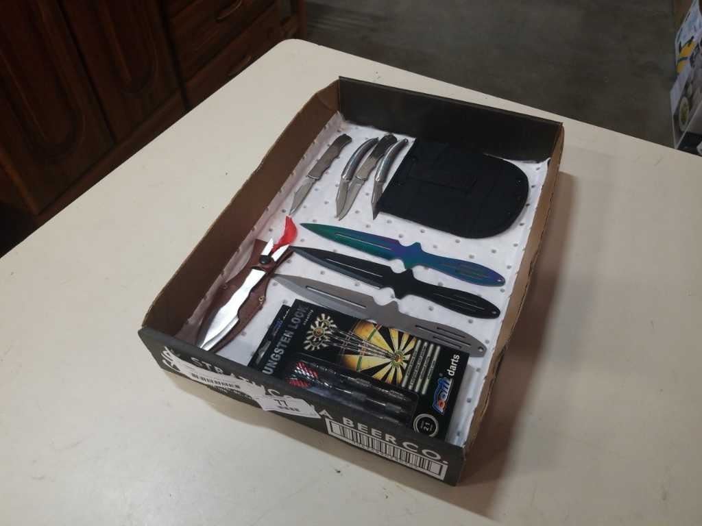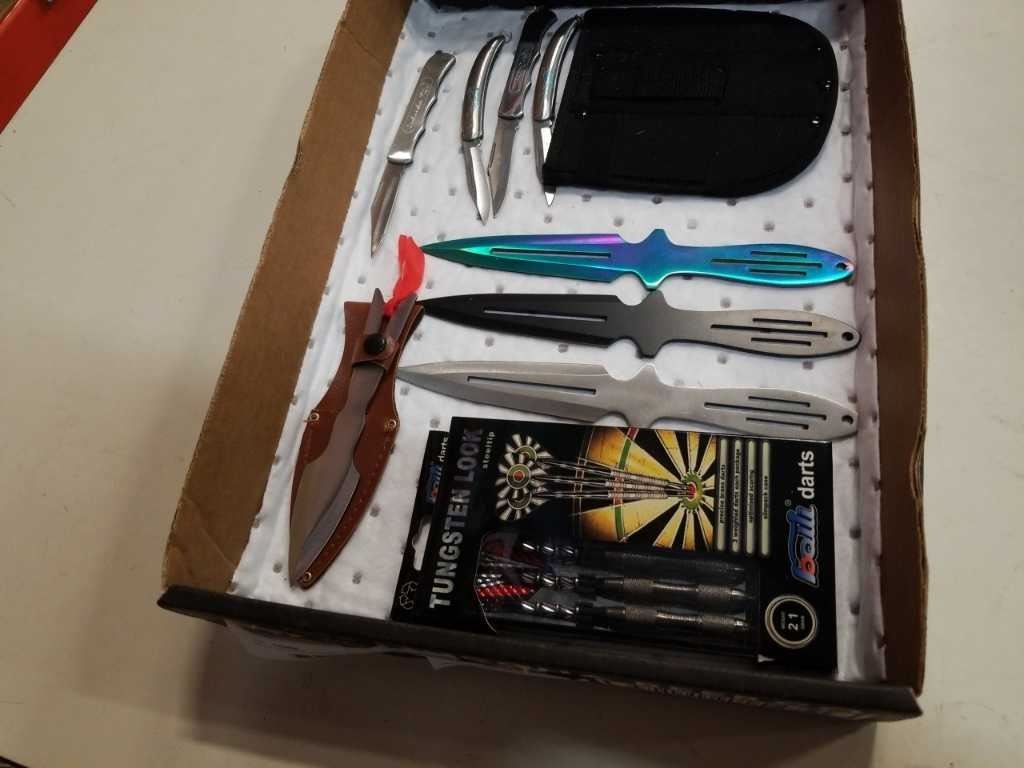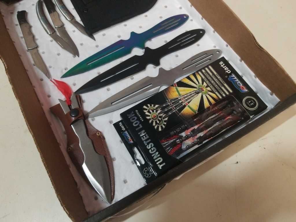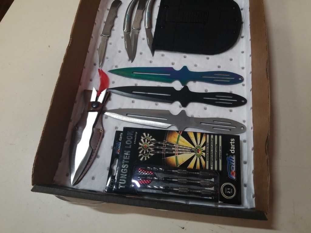 TRAY OF NEW KNIVES AND DARTS - THROWING KNIVES, FOLDING KNIVES