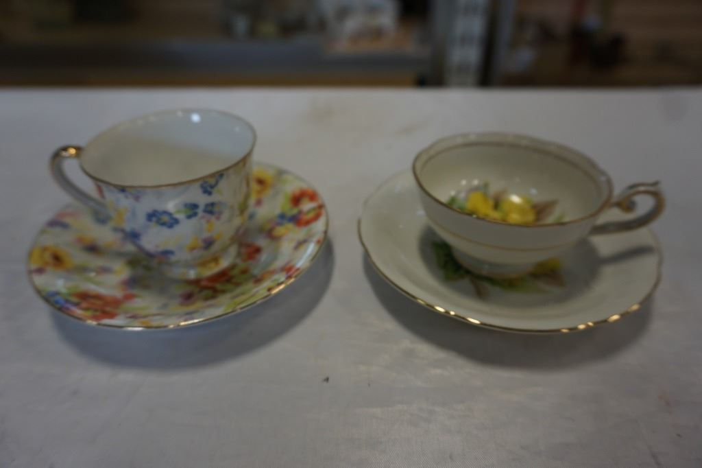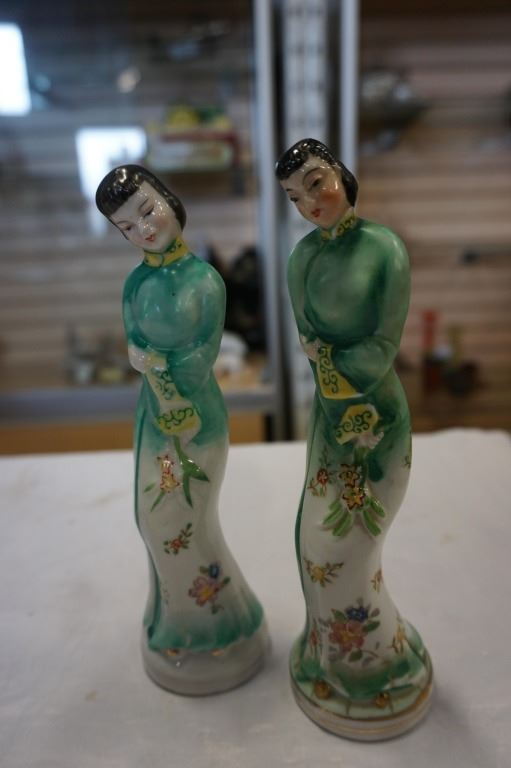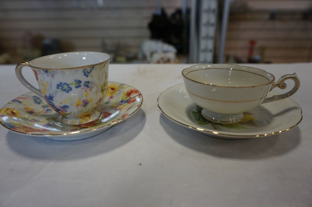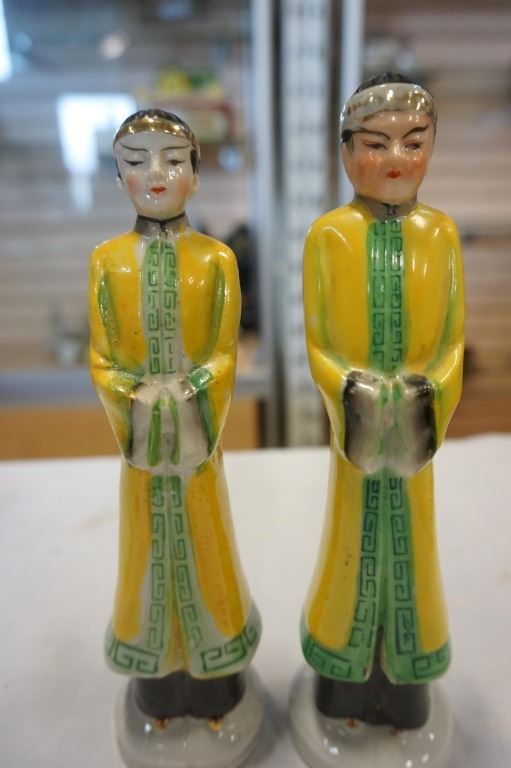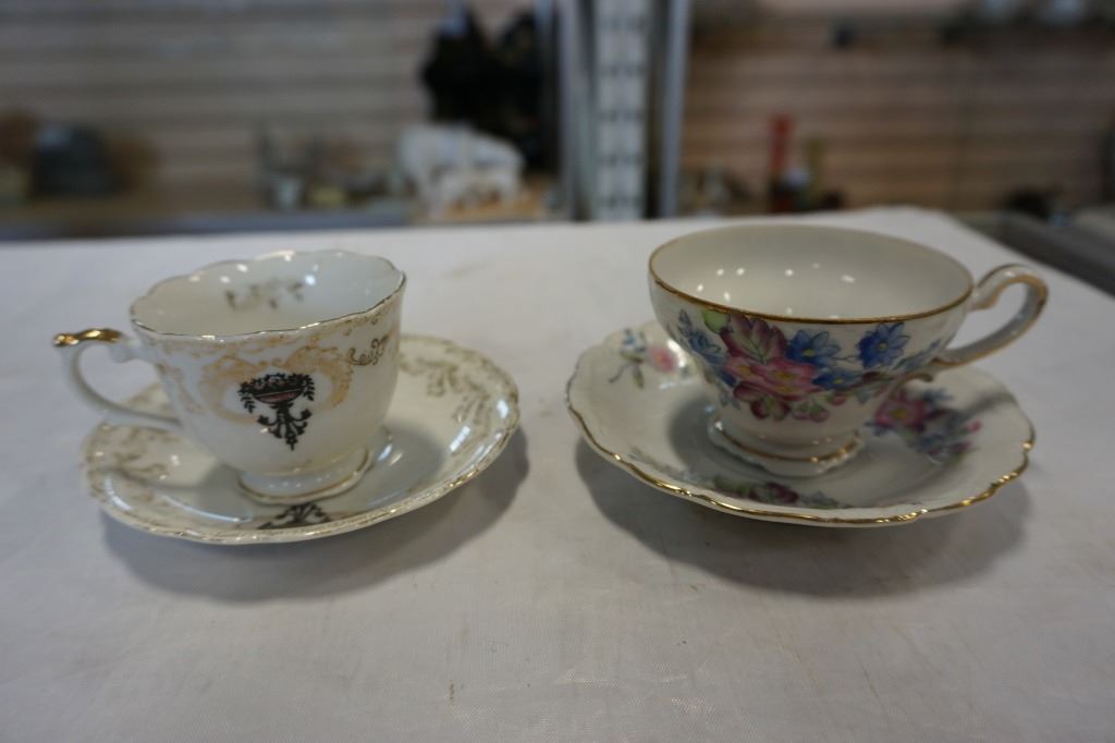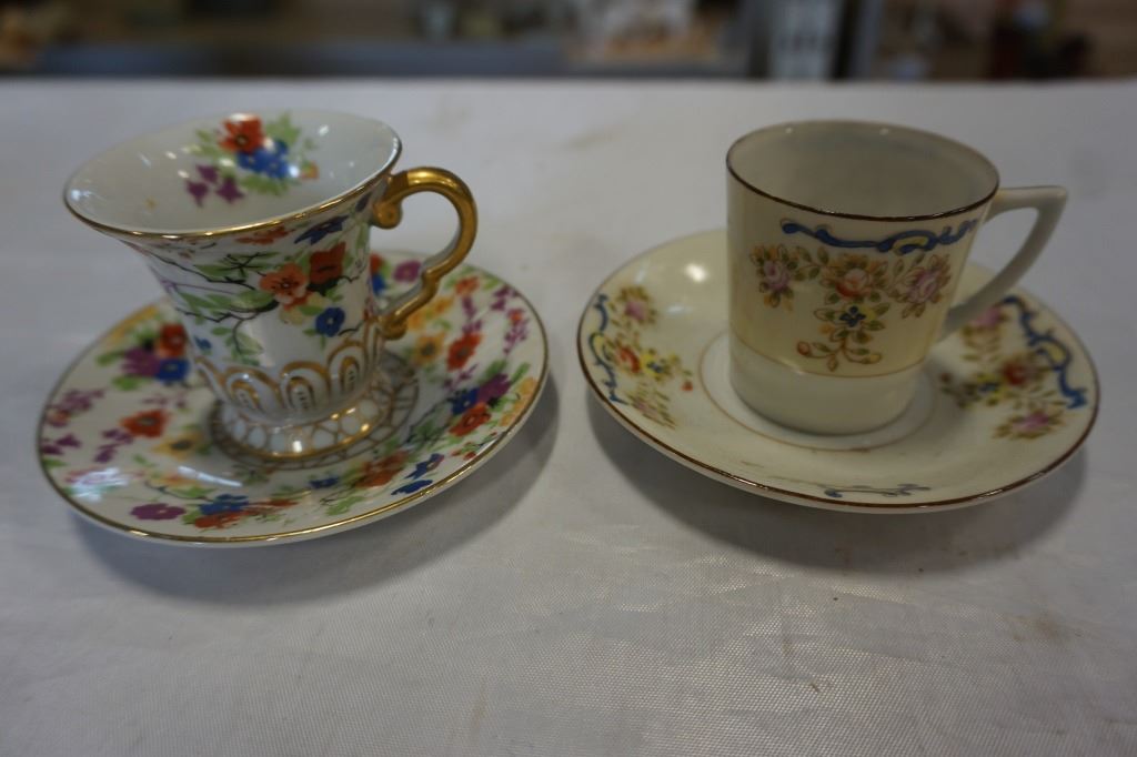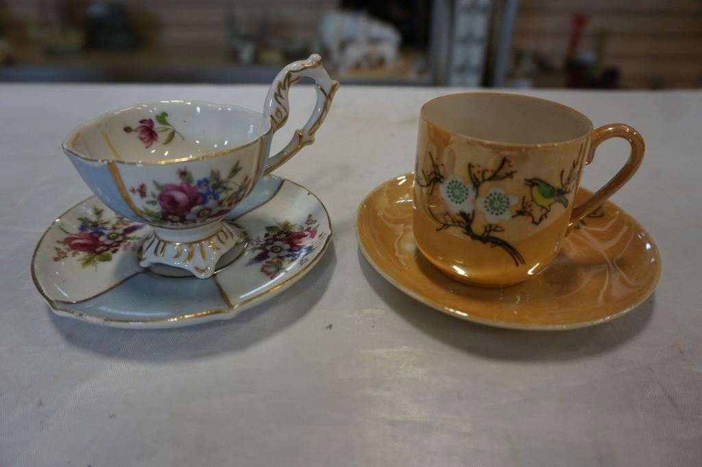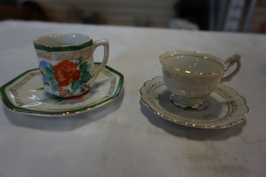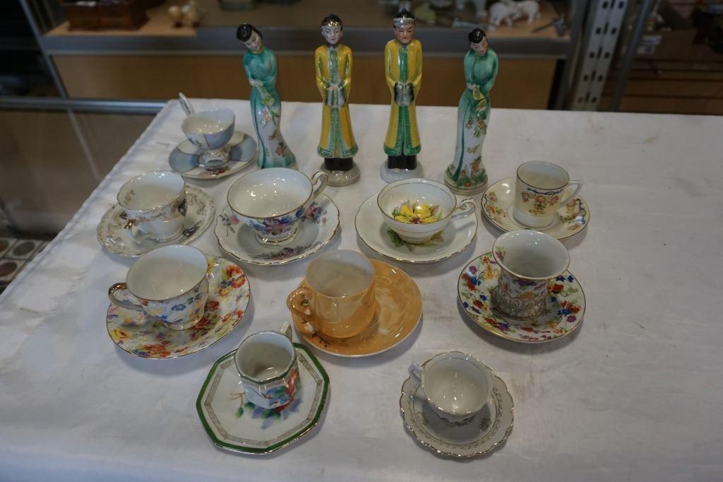 TRAY OF OCCUPIED JAPAN CHINA CUPS AND SAUCERS AND FIGURES