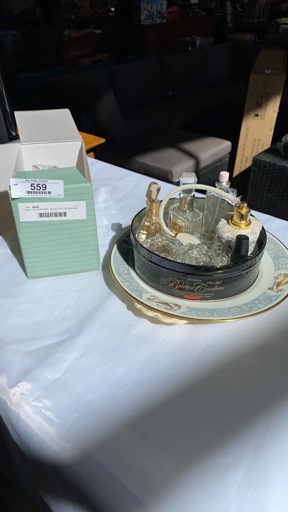 TRAY OF PERFUME, AVON CAT CREAM AND SUGAR, CHINA PLATES