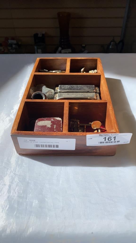 TRAY OF PINS, HARMONICAS, PIPE, CUFFLINKS