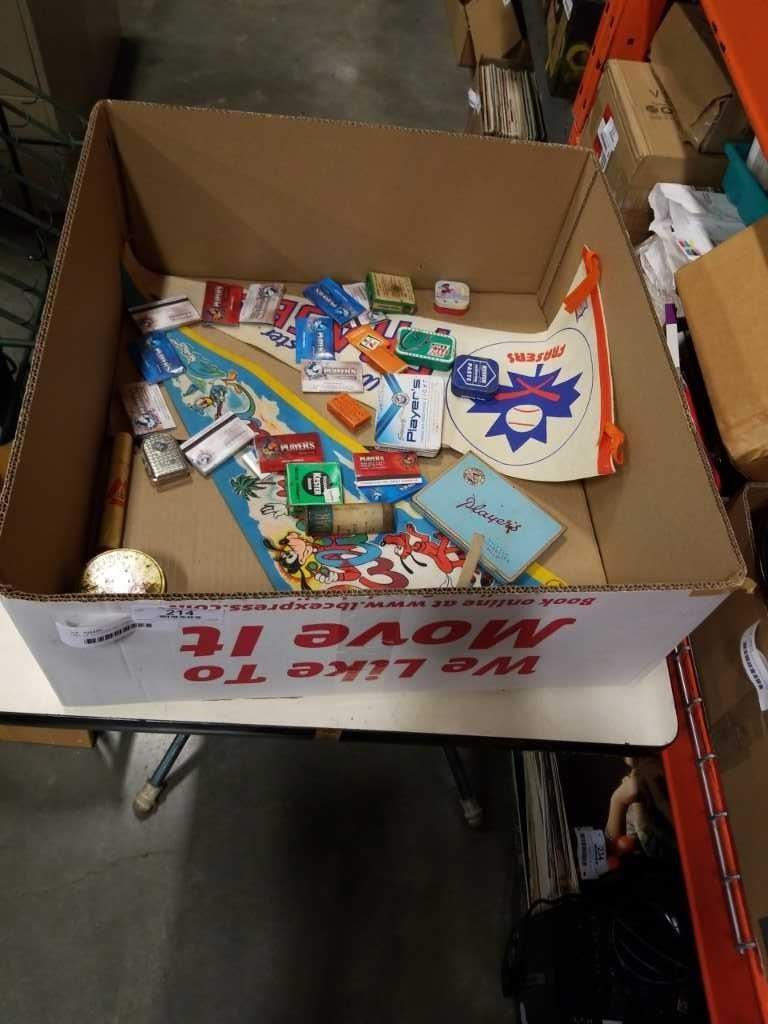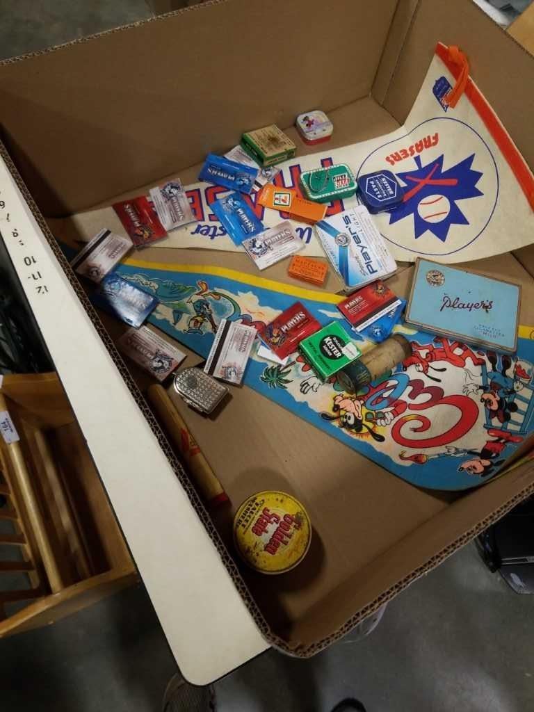 TRAY OF PLAYERS MATCHES, TINS AND SPORTS BANNERS