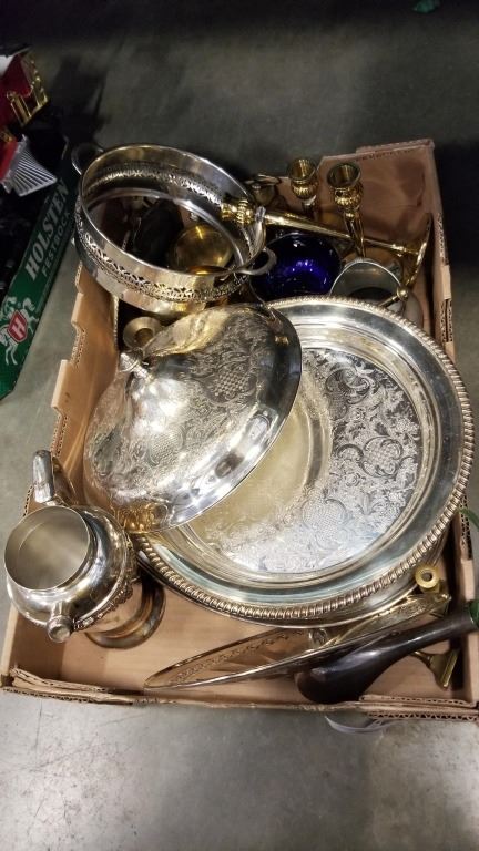 TRAY OF SILVER PLATE AND BRASS SERVING PIECES, CANDLE STICKS