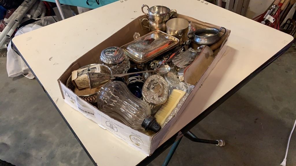 TRAY OF SILVER PLATE, BRUSH, COMB, SERVING PIECES