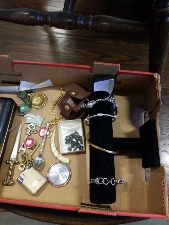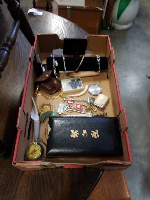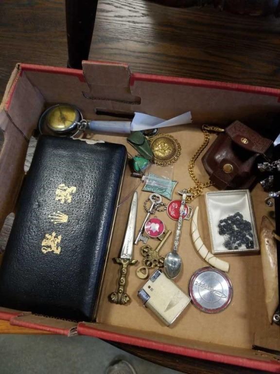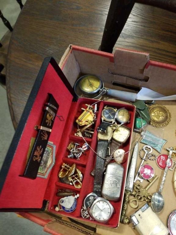 TRAY OF VINTAGE AND ANTIQUE COLLECTIBLES MEDALS, POCKET WATCHES AND MORE