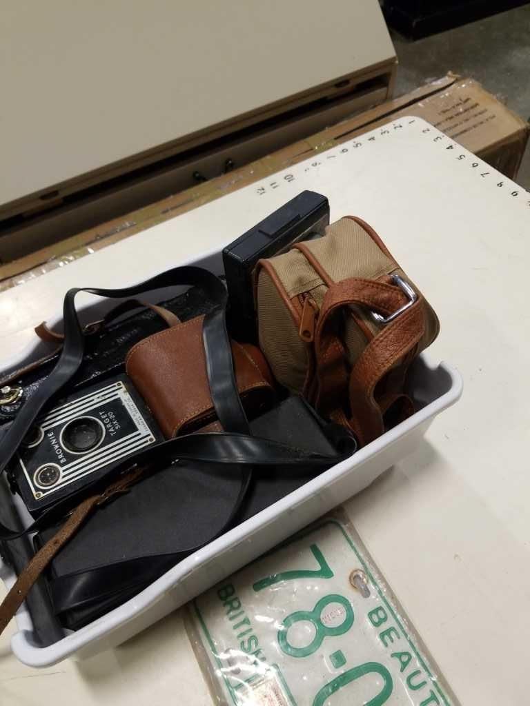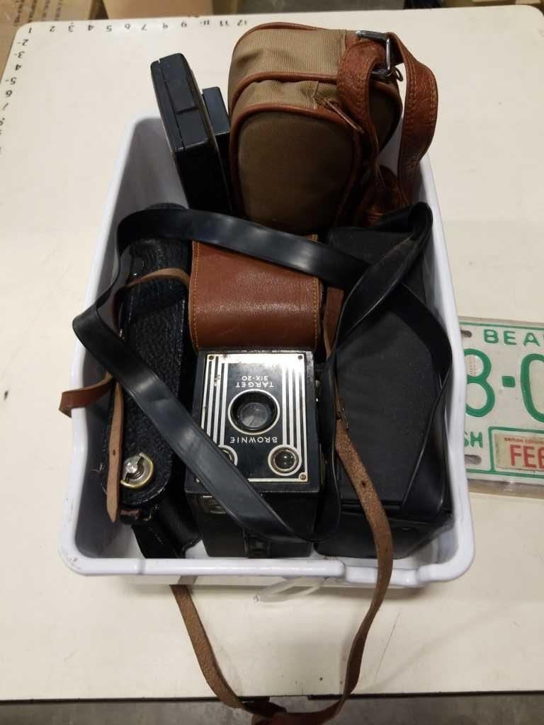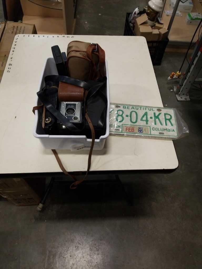TRAY OF VINTAGE CAMERAS AND EXPO 86 LICENCE PLATE