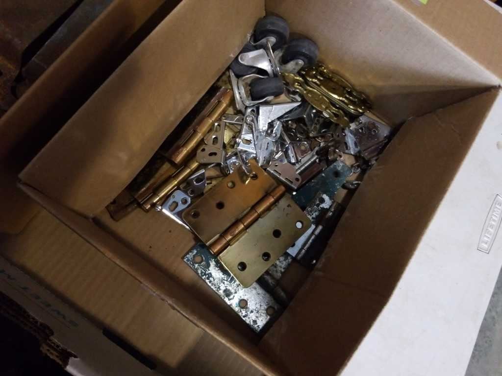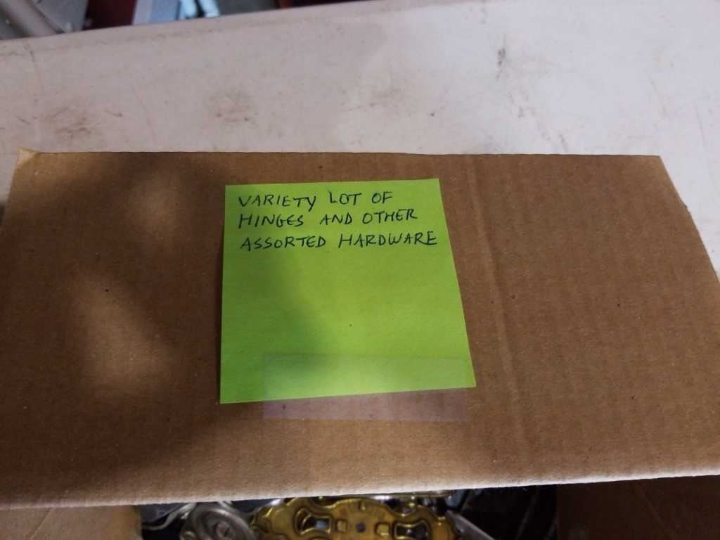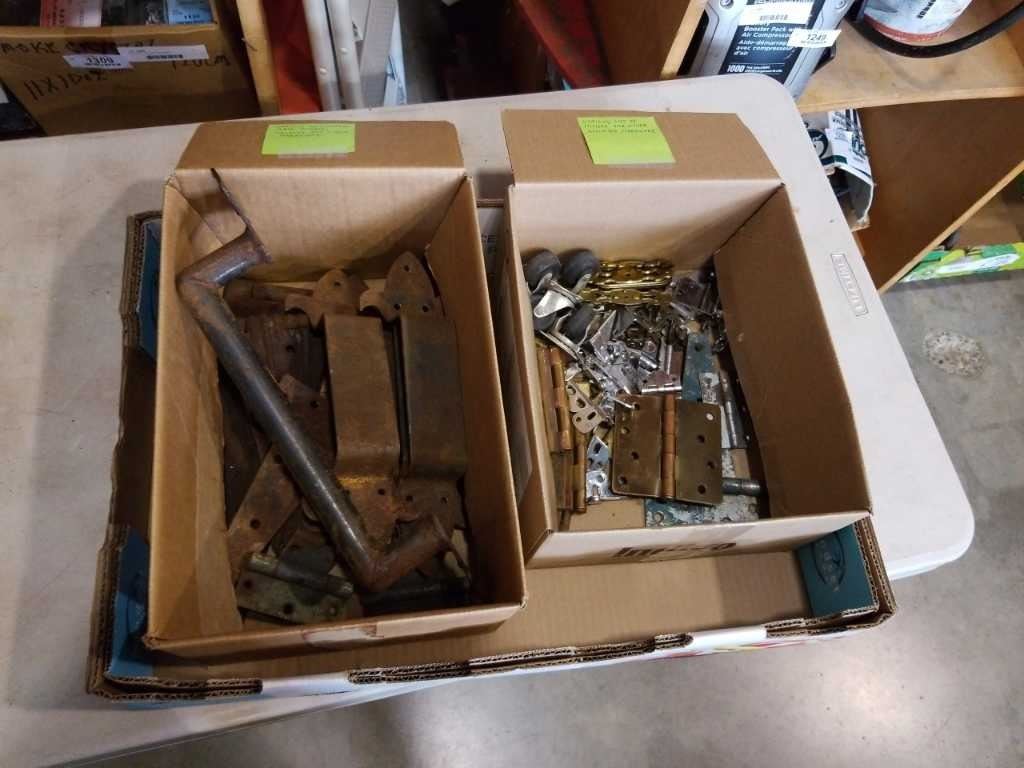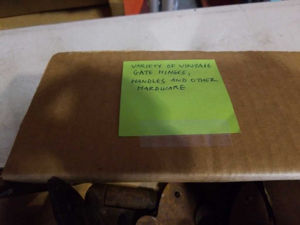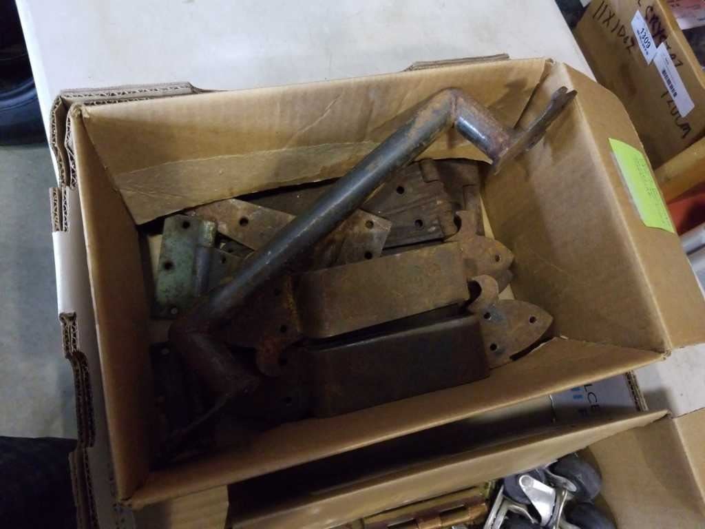 TRAY OF VINTAGE GATE HINGES, HANDLES AND OTHER HARDWARE