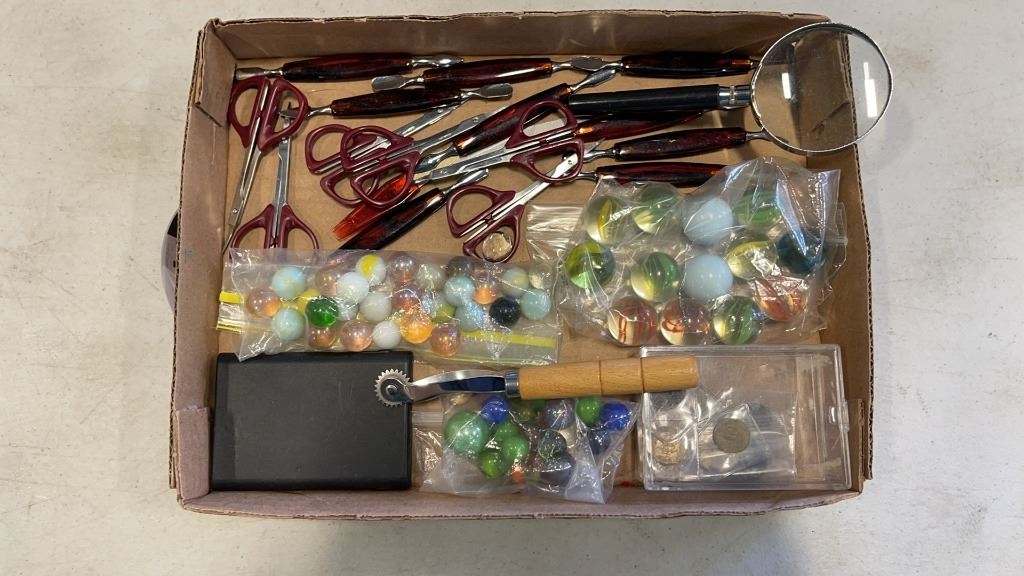 TRAY OF VINTAGE SCISSORS, MARBLES, COINS ETC