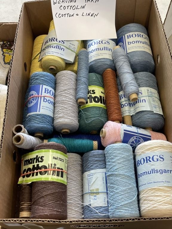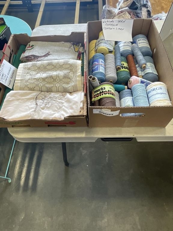 TRAY OF WEAVING YARN AND VINTAGE TABLE CLOTHS