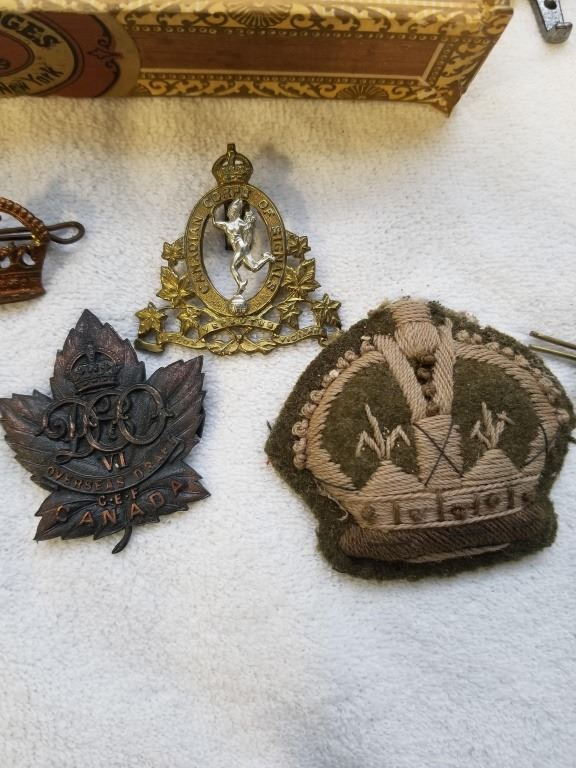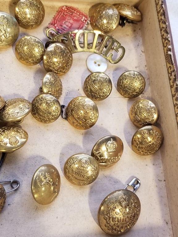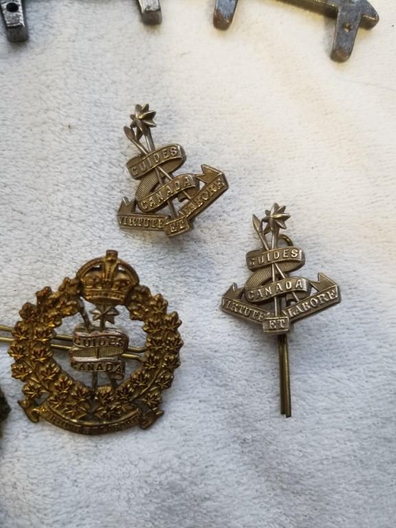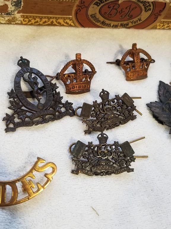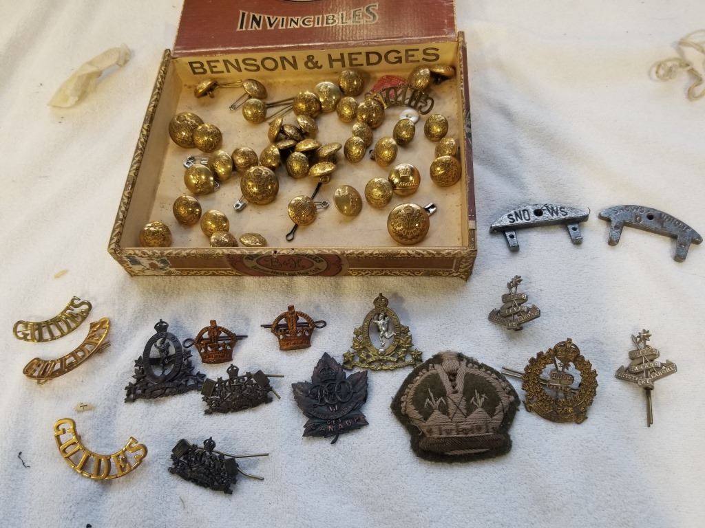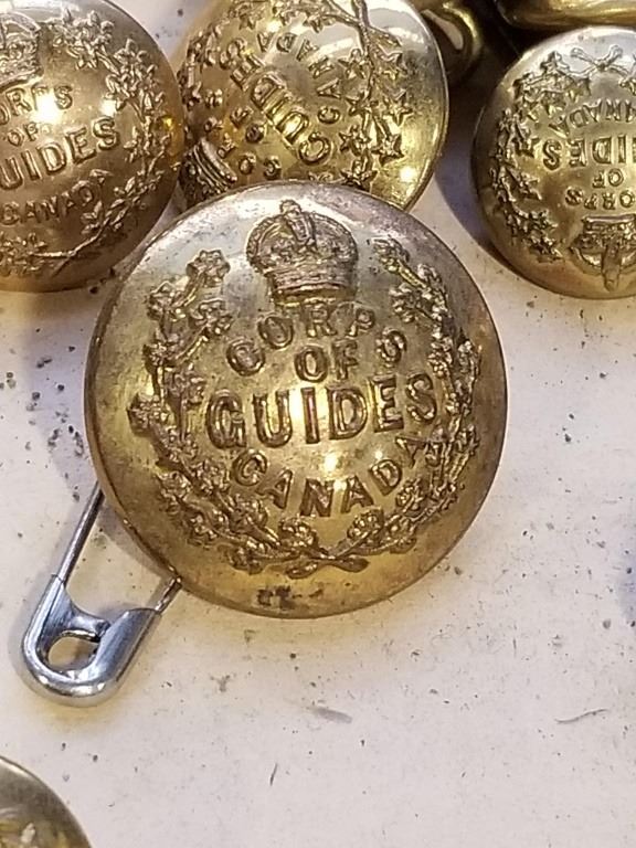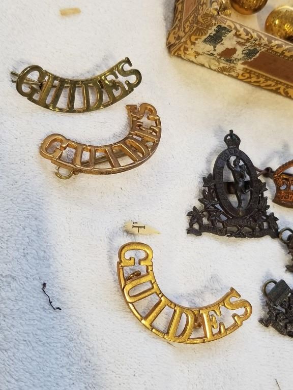 TRAY OF WW2 ROYAL CANADIAN SIGNAL CORPS AND CORPS OF GUIDES BRASS PINS, BADGES AND BUTTONS