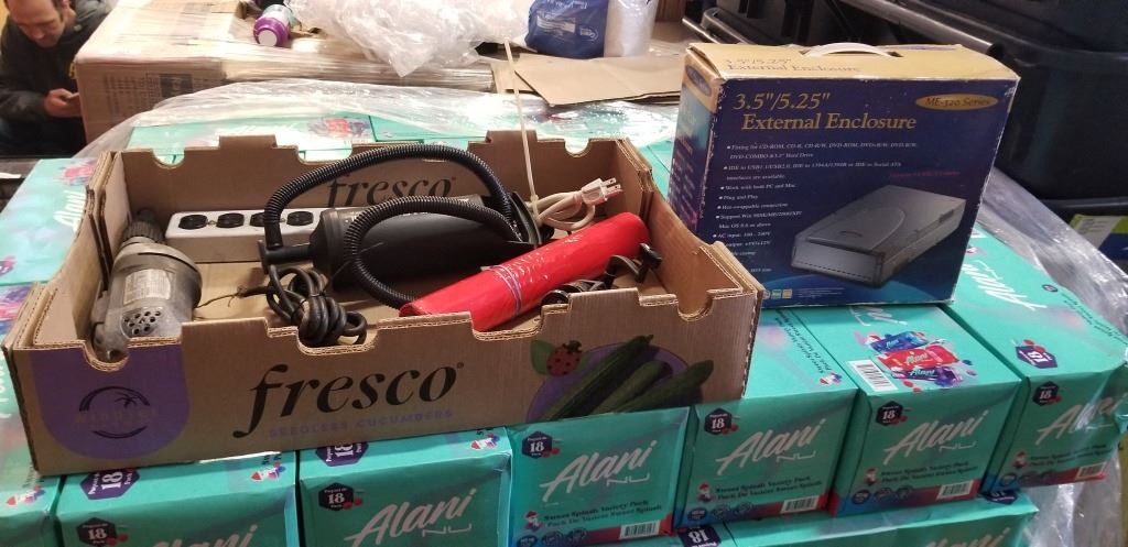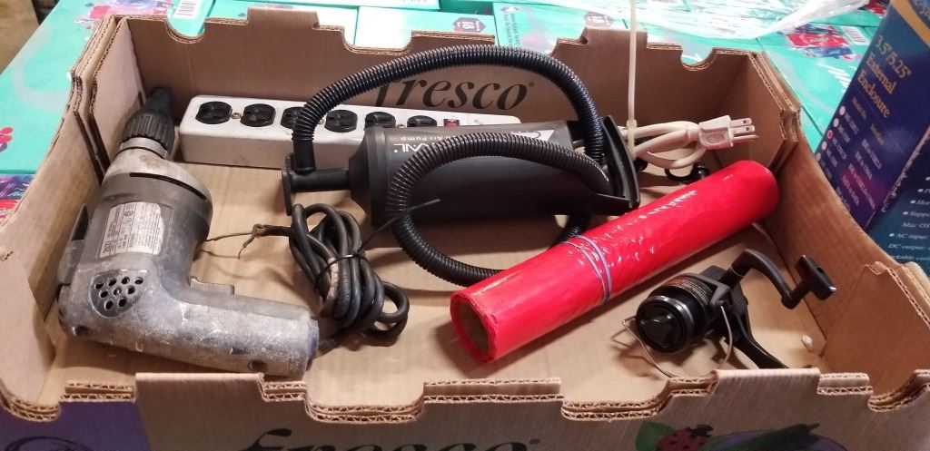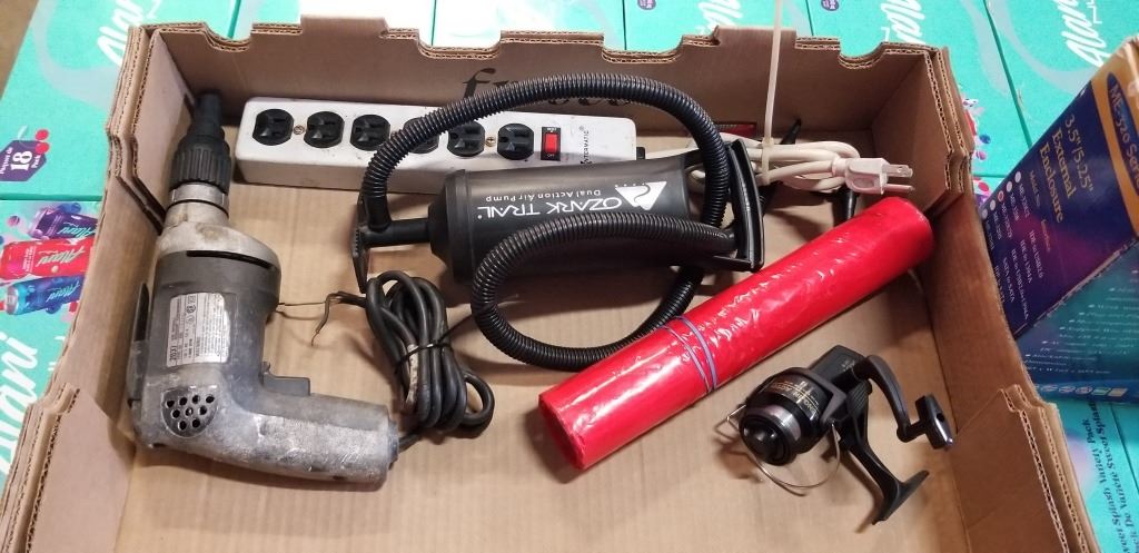 TRAY WITH ELECTRIC DRILL, POWER BAR, FISHING REEL ETC