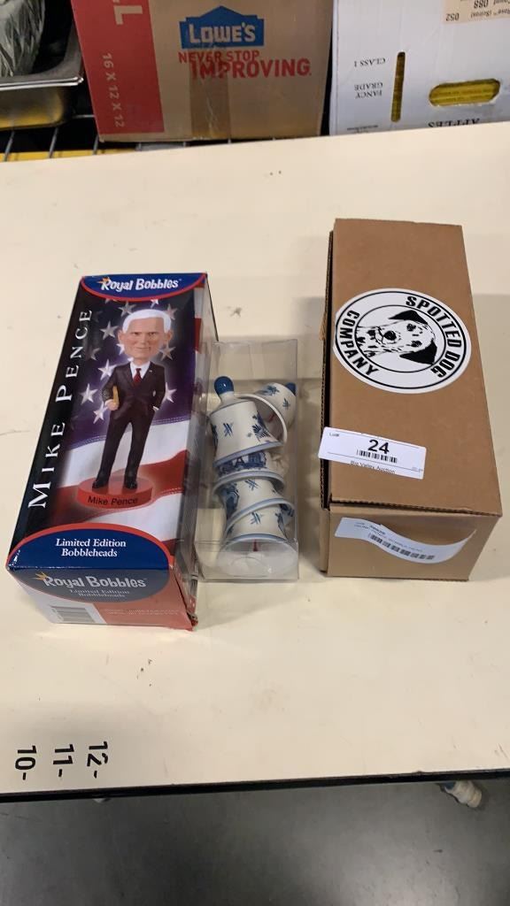 TRUMP PENCE BOBBLE HEAD, COMMEMORATIVE WINE GLASS AND PARIS BELLS