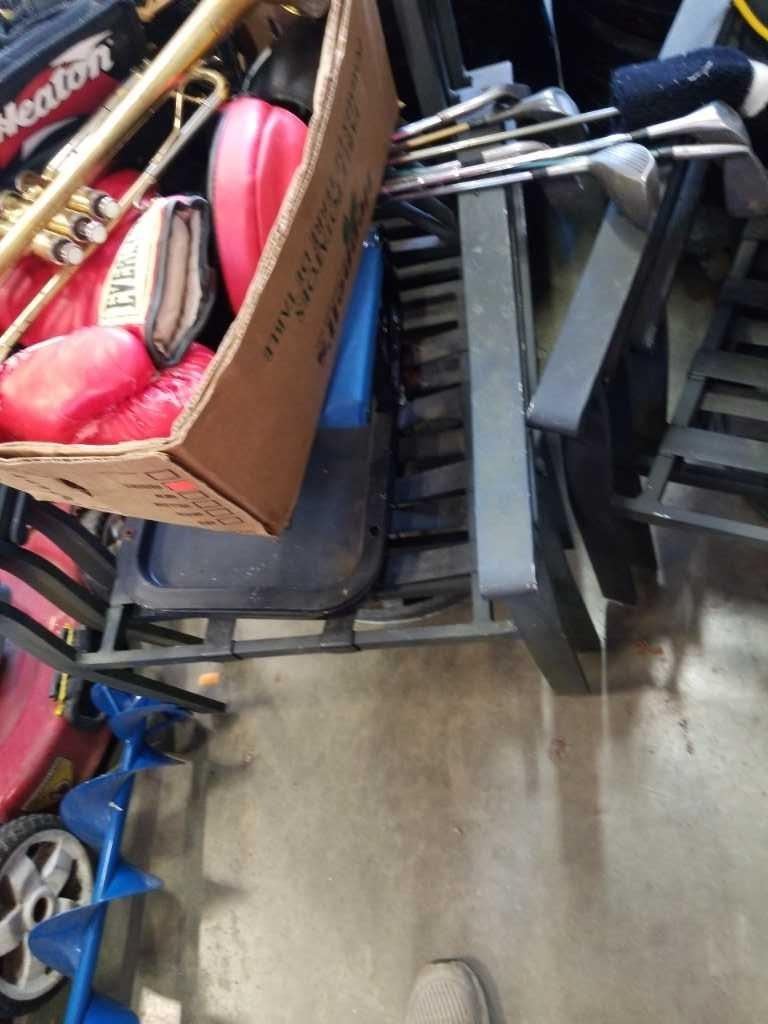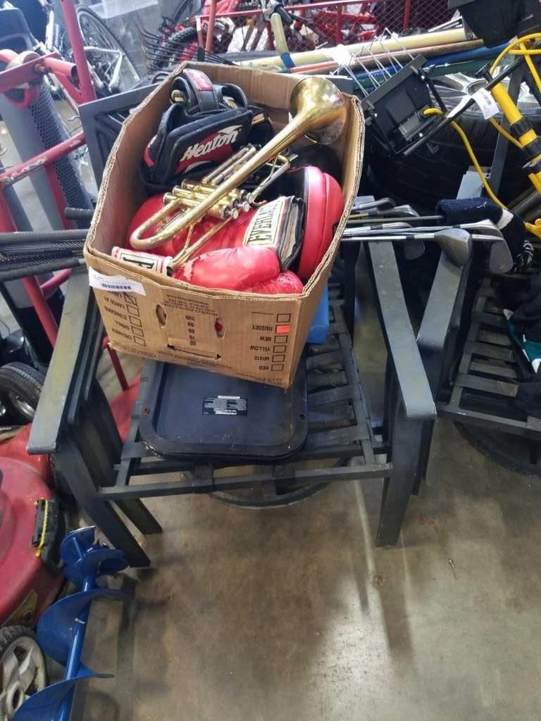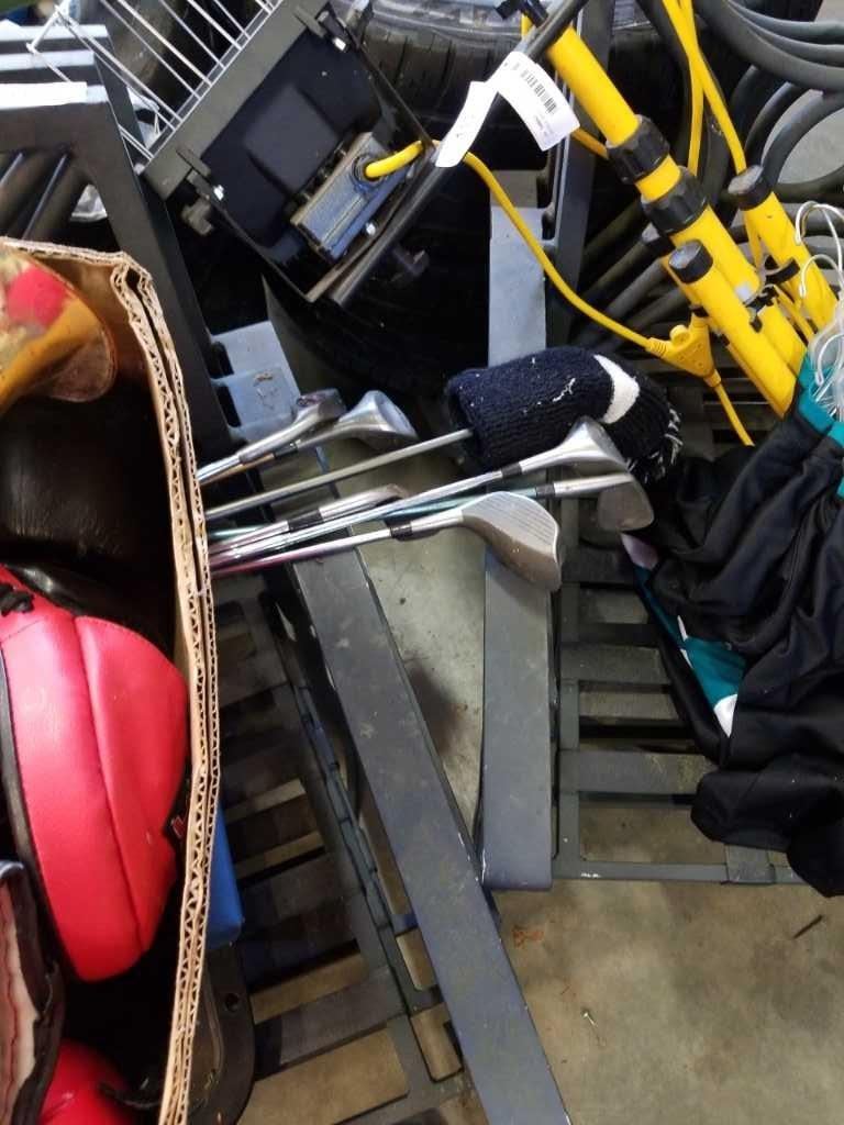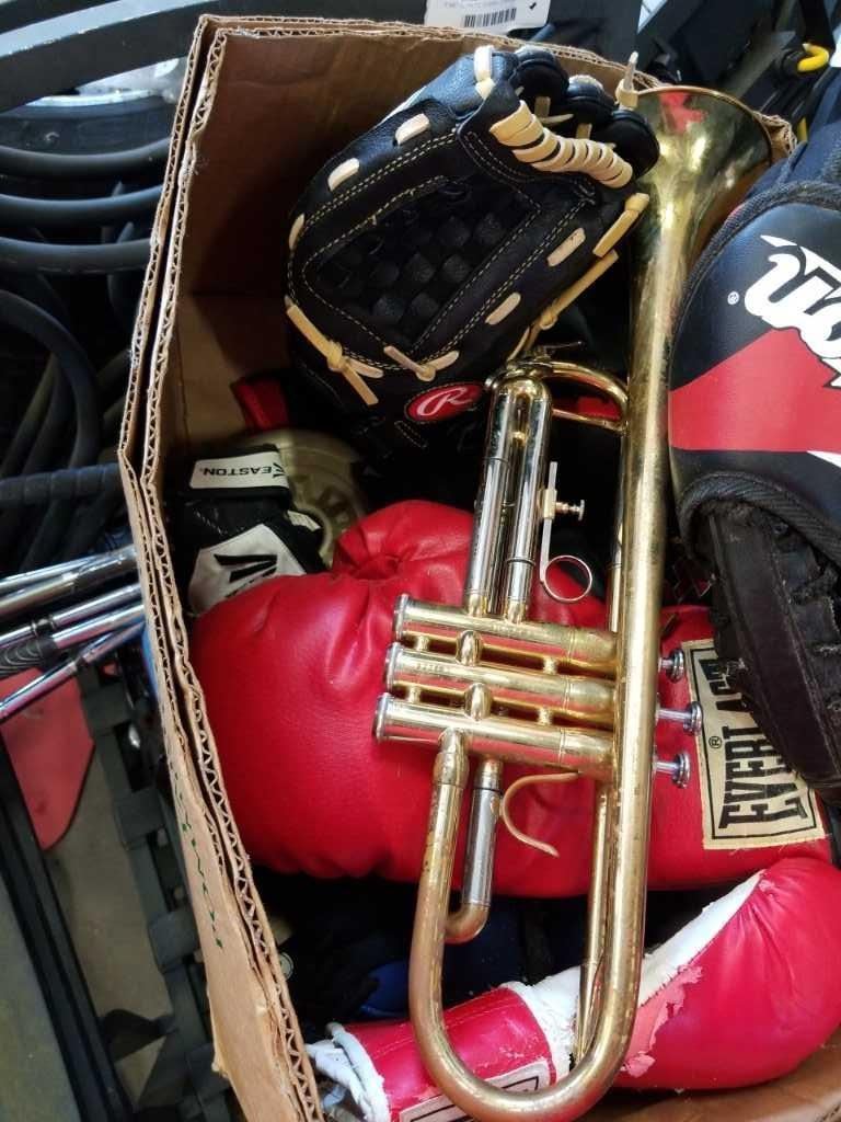 TRUMPET, BOXING GLOVES, GOLF CLUBS AND SHOP CART