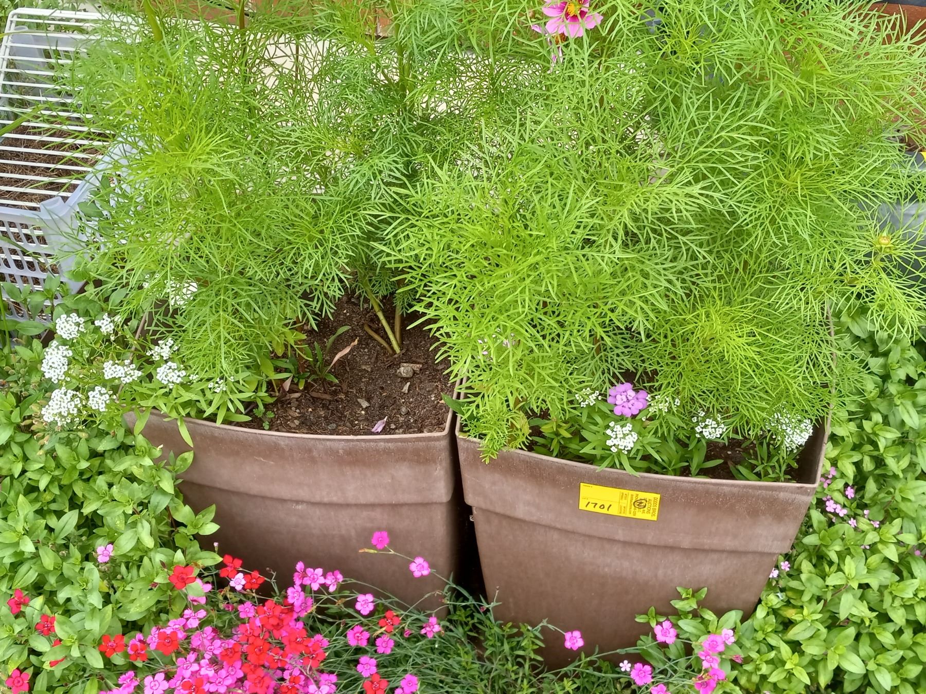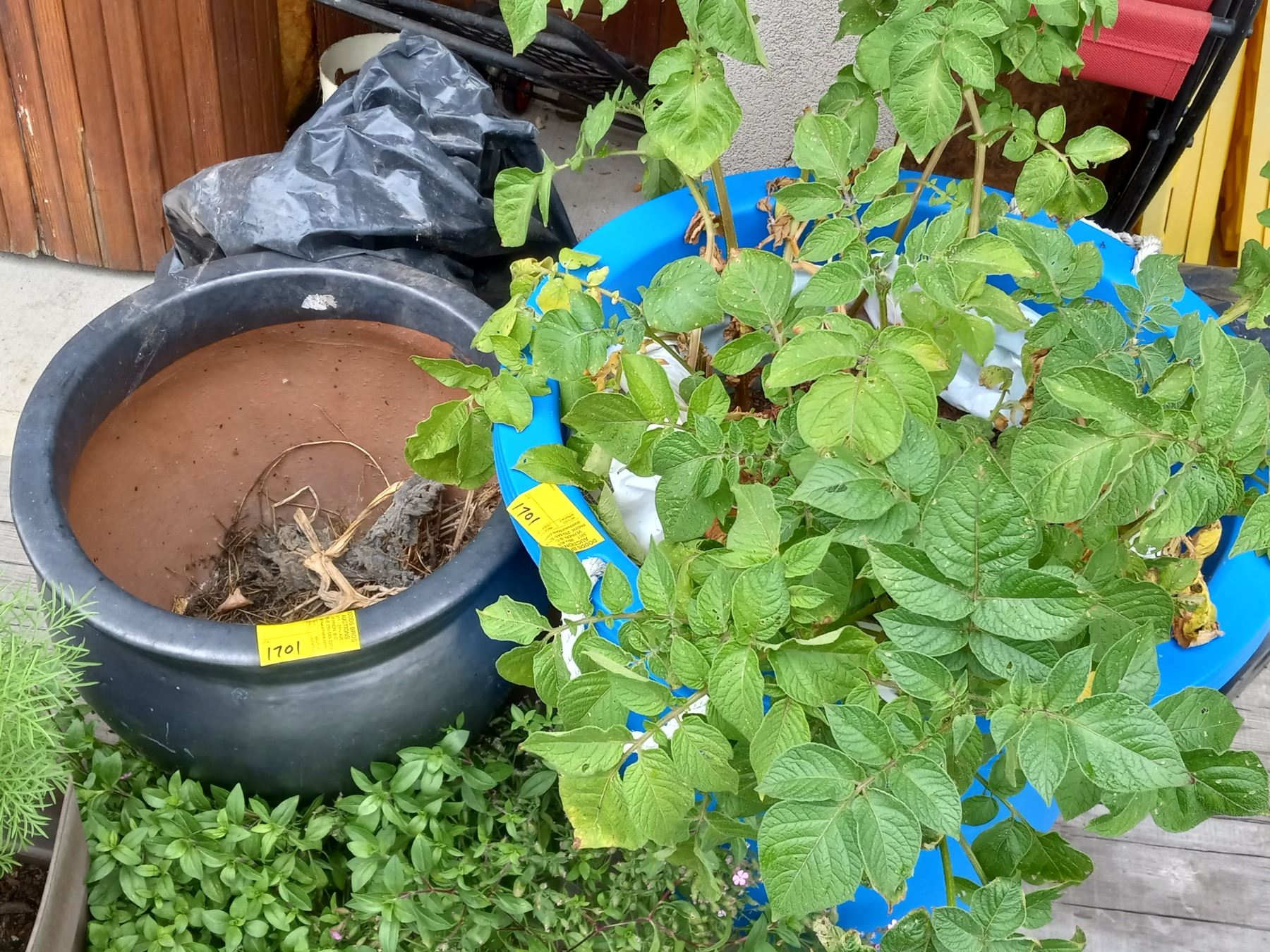 TUB W/POTATOES, 2 FLOWER POTS & BLACK POT