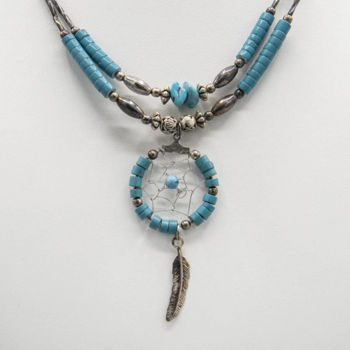 TURQUOISE BEAD NECKLACE AND BRACELET SET. NAVAJO TURQUOISE DISC BEAD NECKLACE AND BRACELET SET WITH STERLING SILVER BEAD ACCENTS DREAMCATCHER PENDANT ON NECKLACE. 2 PIECE SET. 81.5 Cttw or 16.3 Total Grams . Necklace Approx 18 " and the Bracelet Approx 6 "