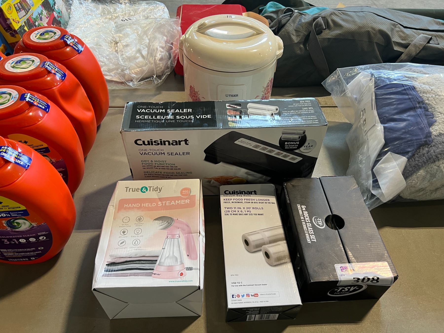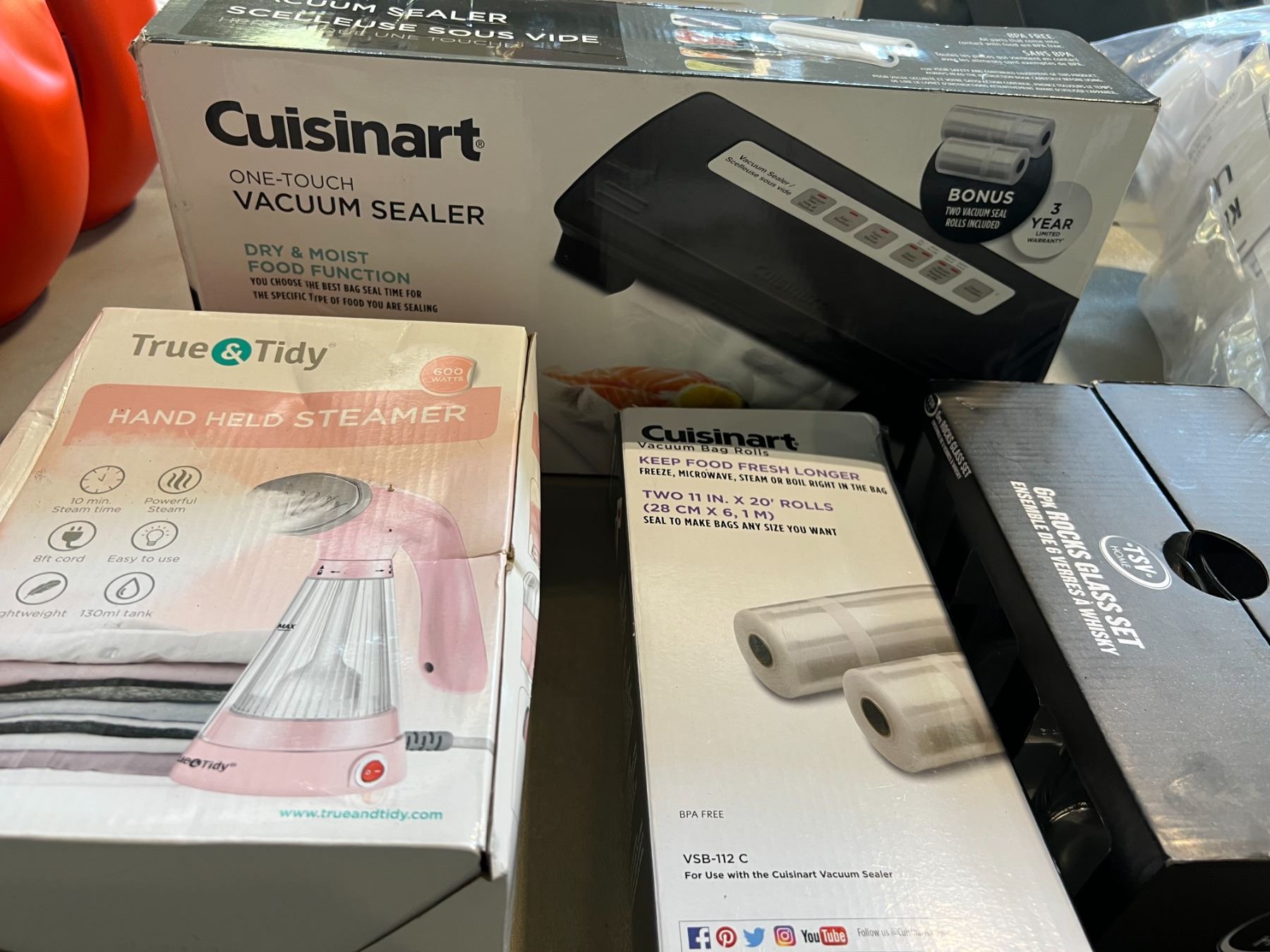 TVS HOME 6 PACK OF ROCKS GLASS SETS, CUISINART VACUUM SEALER/VACUUM BAG SET, TRUE & TIDY HAND HELD STEAMER AND RICE COOKER
