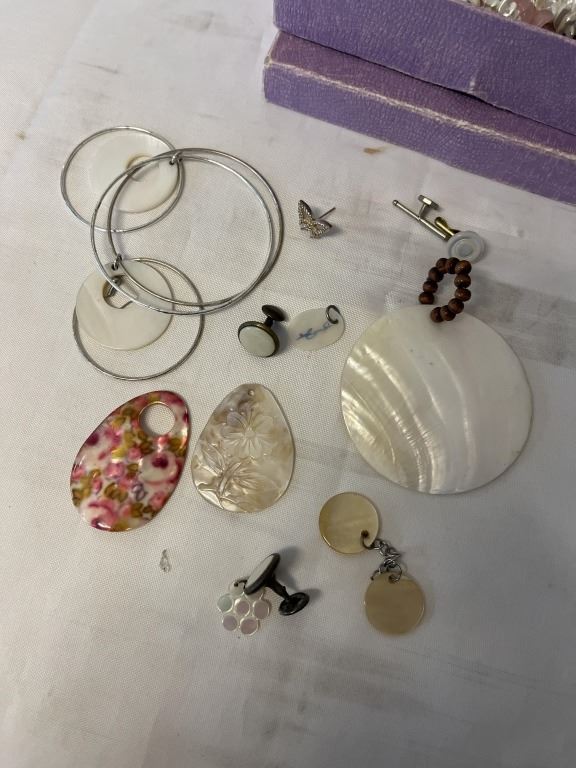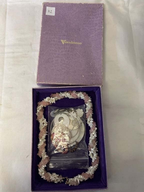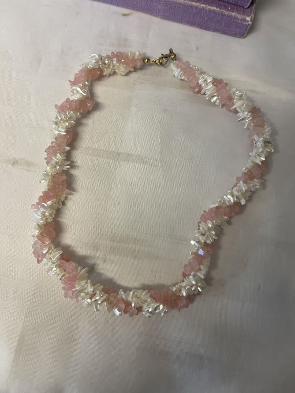 TWISTED NATURAL ROSE QUARTZ AND FAUX PEARLS NECKLACE AND MISC MOTHER OF PEARL JEWELRY