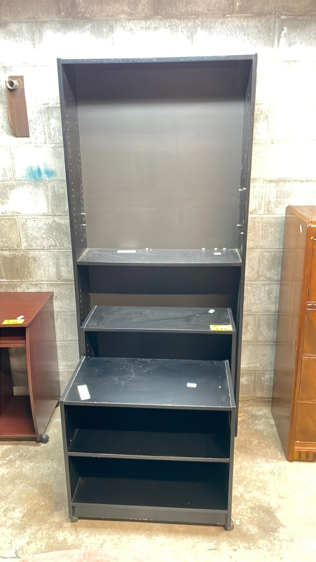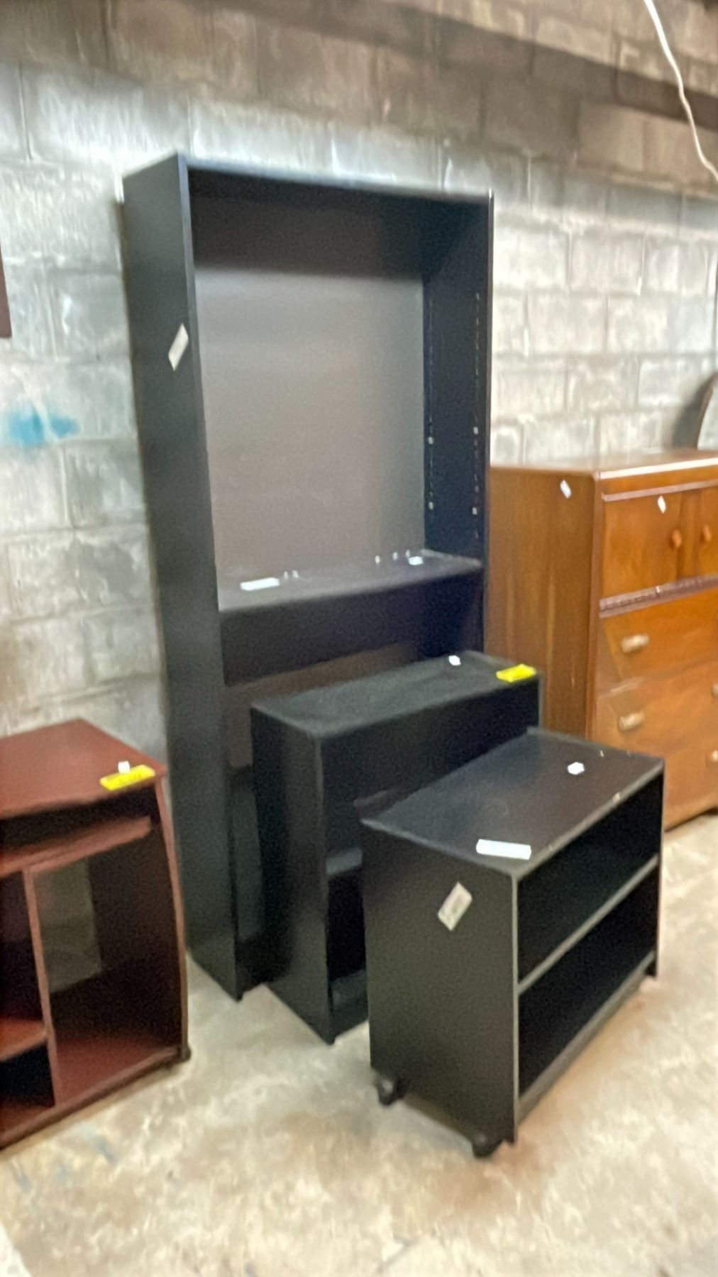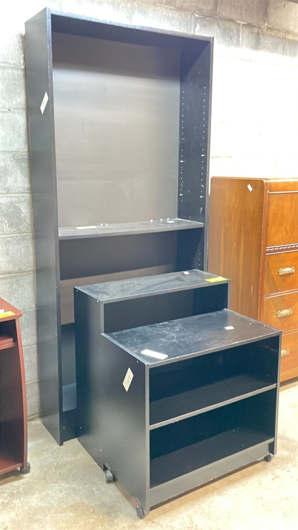 TWO (2) BOOK CASES. 6 SHELVES. 35 X 11 X 79, 2 SHELVES 29 X 11 X 31. ROLLING TV STAND.
