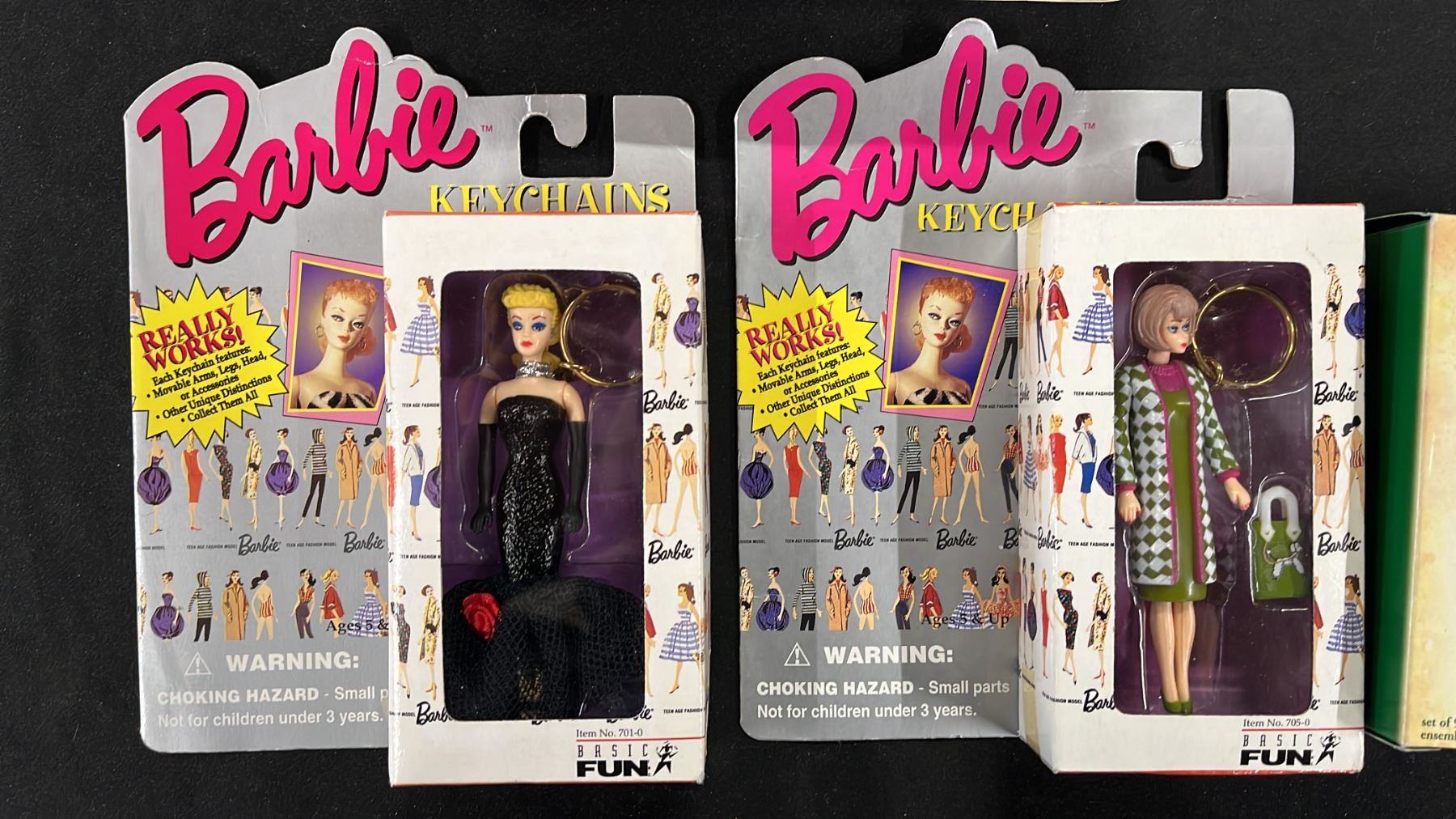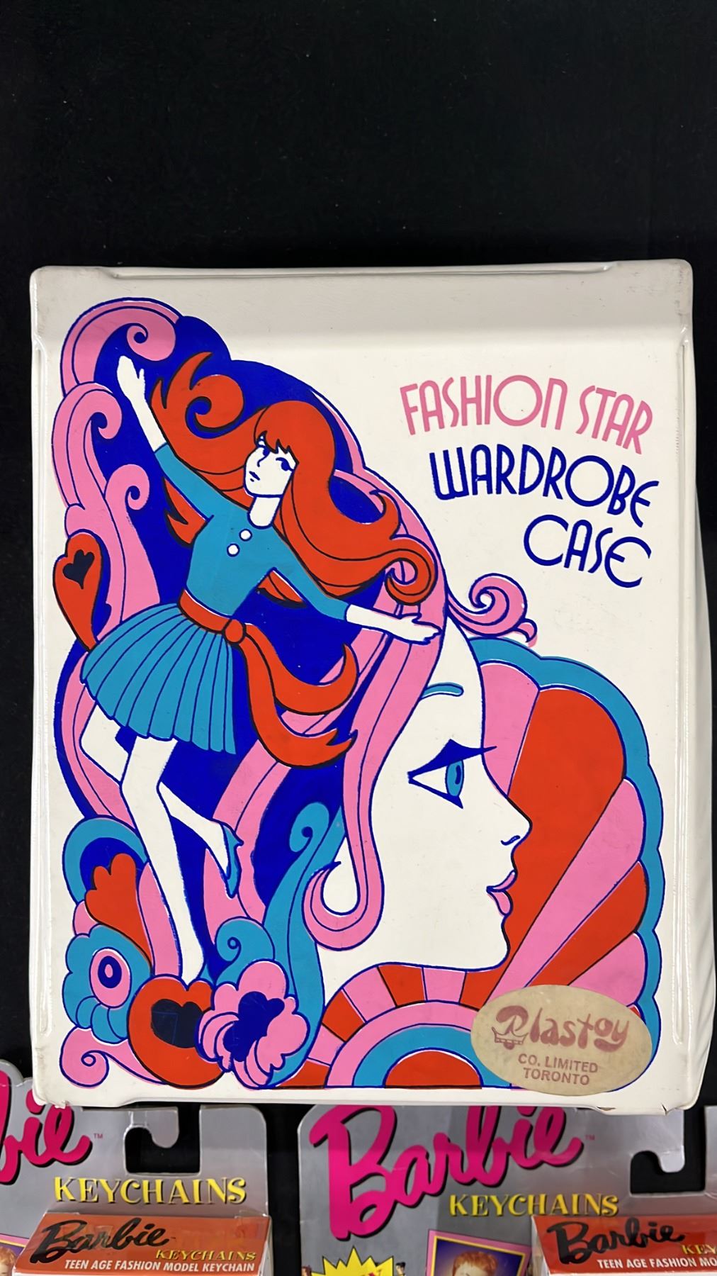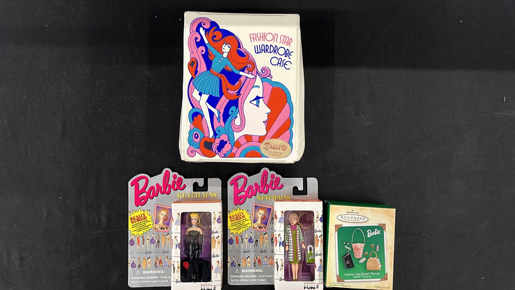 TWO BARBIE KEYCHAINS, FASHION STAR WARDROBE CASE WITH CONTENTS & A HALLMARK BARBIE KEEPSAKE