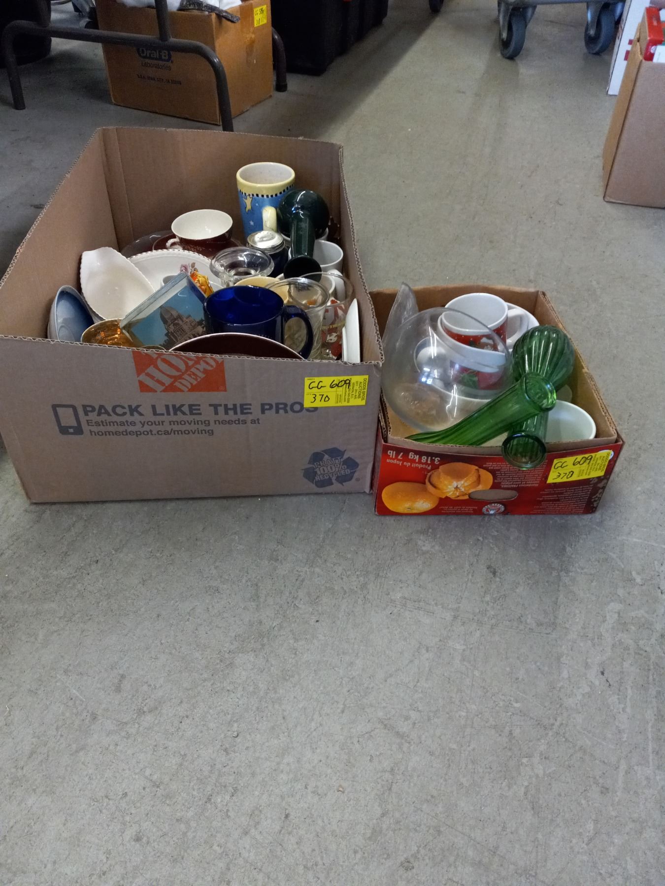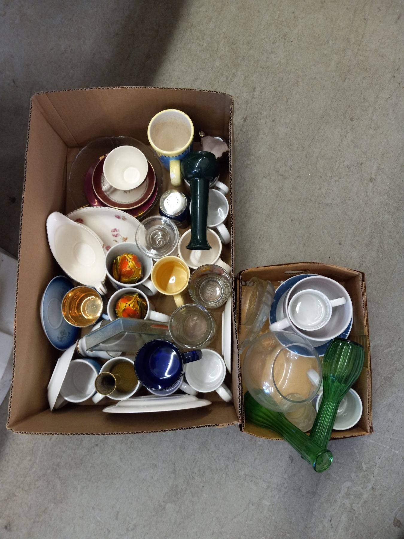 TWO BOXES OF GLASS WARE, COFFEE CUPS AND VASES