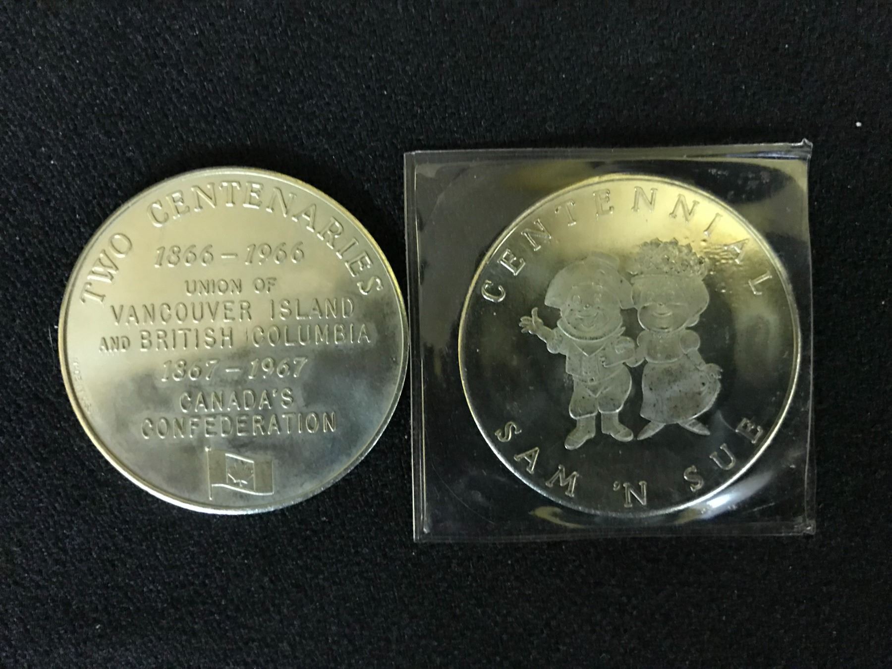 THE TWO CENTENARIES COIN IS THE UNION OF VANCOUVER ISLAND AND BRITISH COLUMBIA AND CANADAS CONFEDERATION