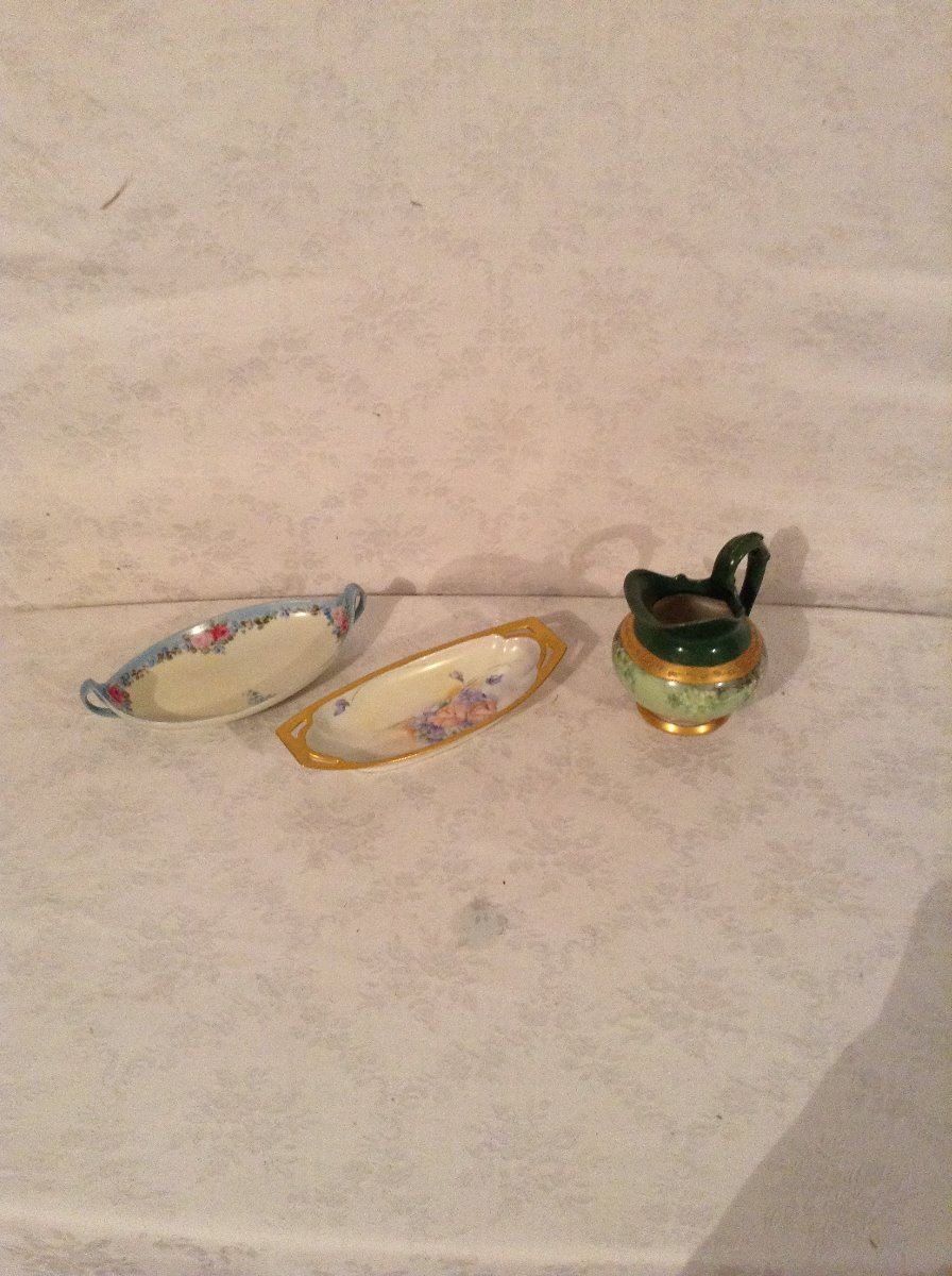 TWO HAND PAINTED AND SIGNED DRESSER DISHES AND SIGNED EWER