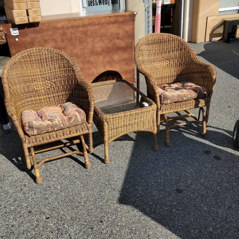 TWO RATTAN GLIDERS WITH GLASSTOP TABLE
