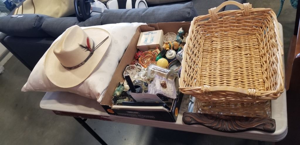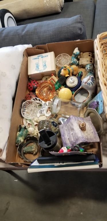 TWO TRAYS OF FIGURINES AND DECOR ITEMS ETC.