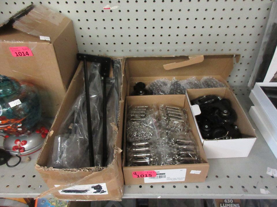 4 Pcs. lot. Set of casters, set of locking casters, 4 pcs. set of 16" metal table legs & box of satin nickel cabinet hinges.