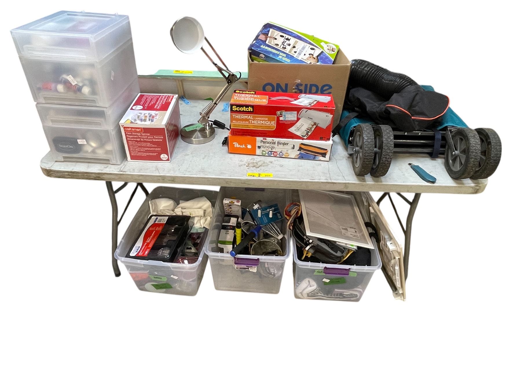 Table Top & Bottom of Misc - Thermal Laminator, Lamp, Paint Storage Spinner, Plastic Cutlary, Home Items, Personal Binder, Etc.