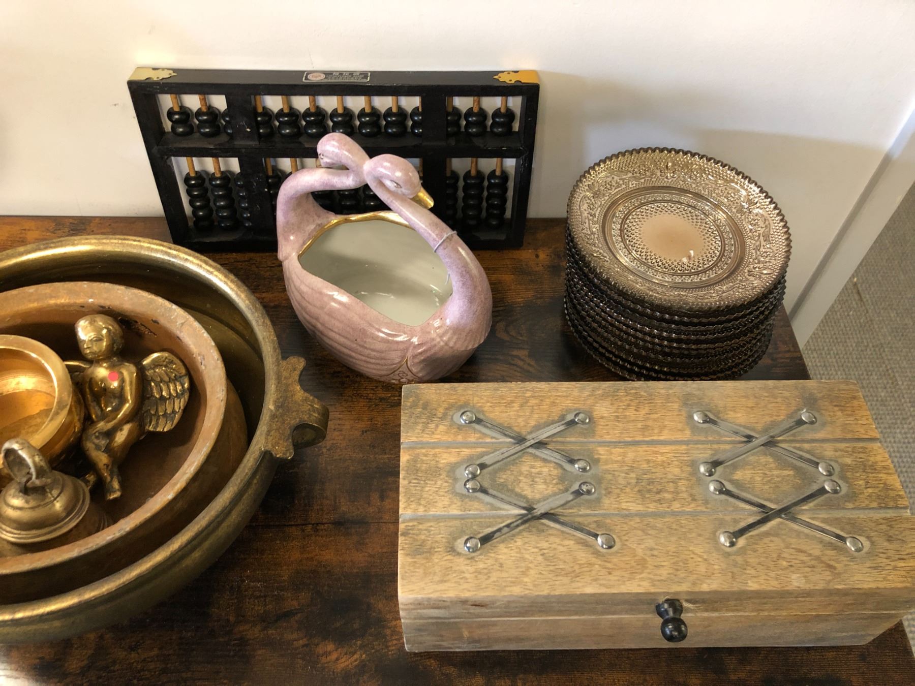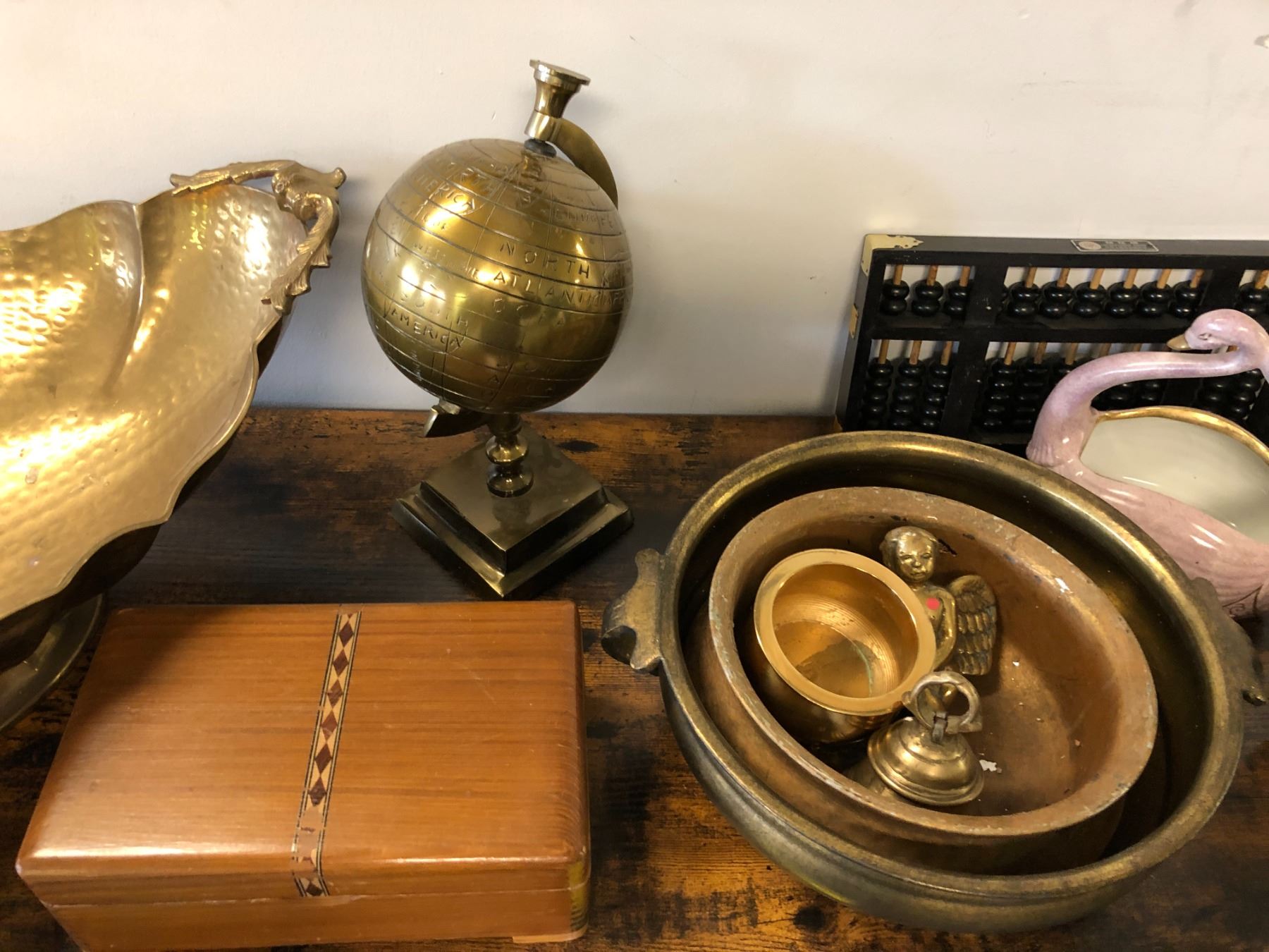 Table Top of Collectibles - Brass Items, Wood Boxes, Brass Globe, Double Swan Bowl and specialty plates