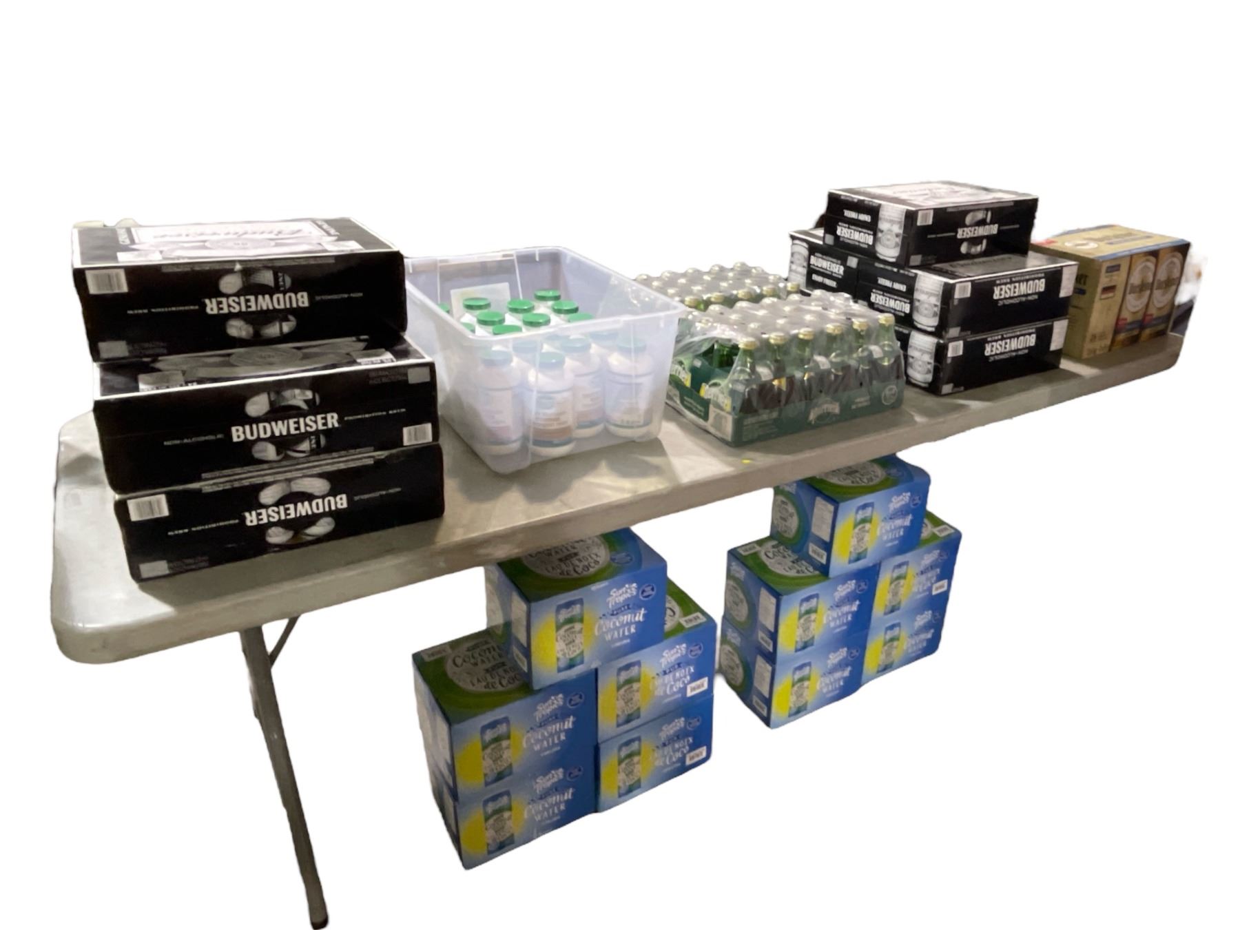 Table lot - Budweiser Non Alcoholic (240 cans) - Organika Reishi mushroom Extract (18 Bottles) - Perrier (48 Bottles) - Warsteiner Non-Alcoholic (47 Bottles) - Coconut Water (240 Cans) (Past Best Before Date)