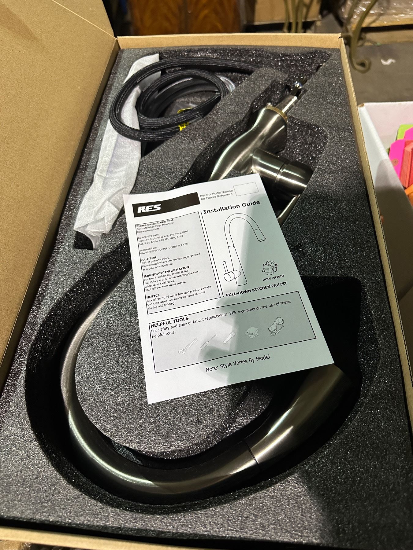 Table of misc items including - 5 boxes of KES kitchen faucets (L6915LF-BN), 4 KES porcelain sink, 3 KES tub filler faucet