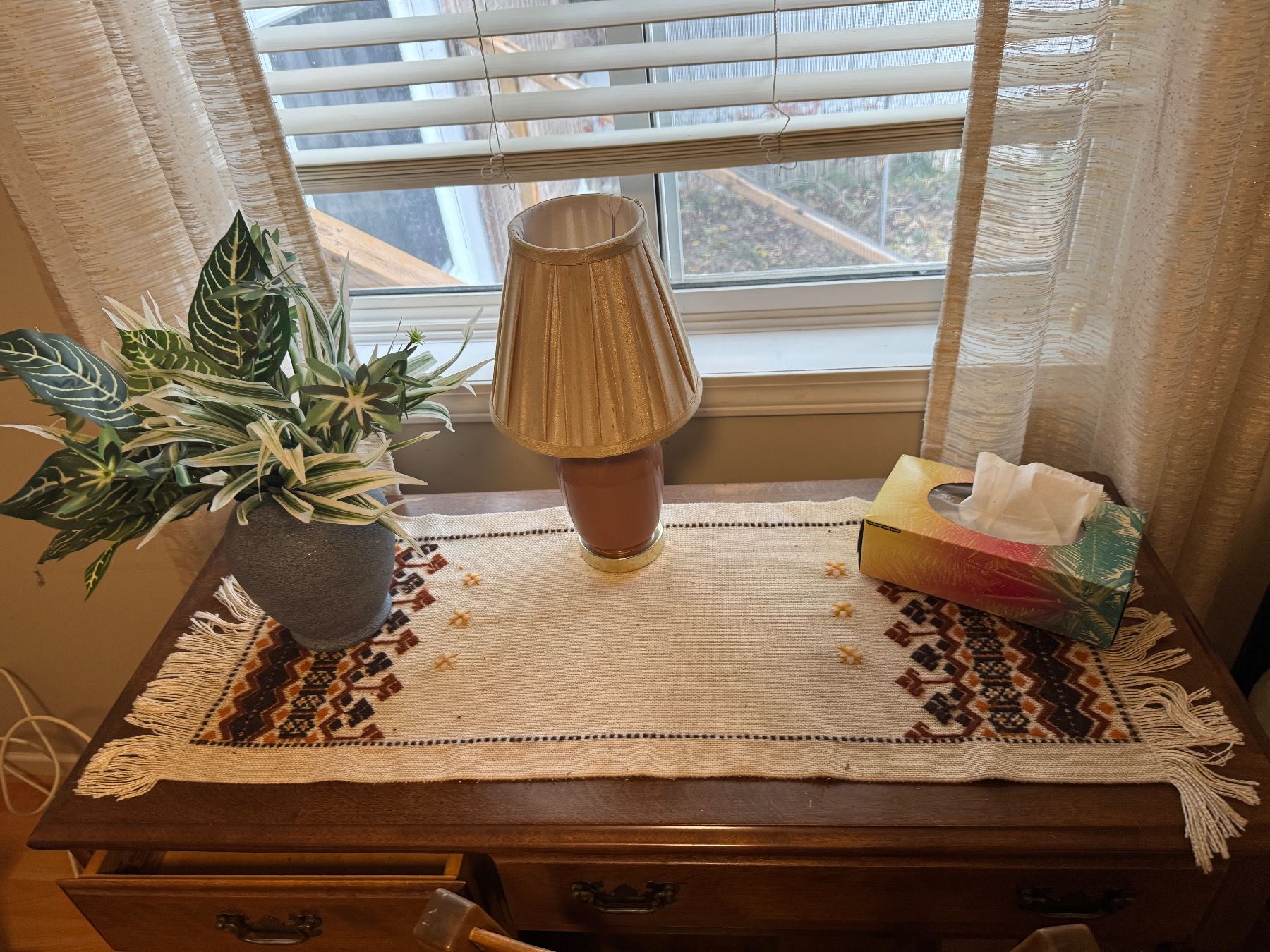 Table runner, artificial plant and lamp