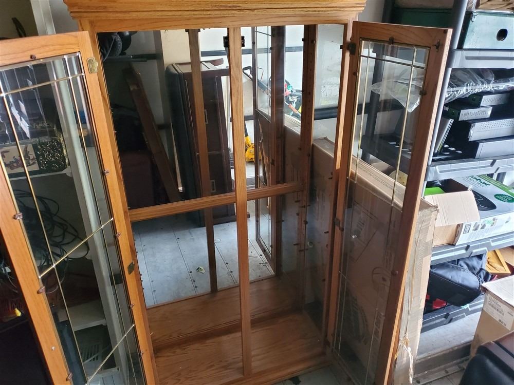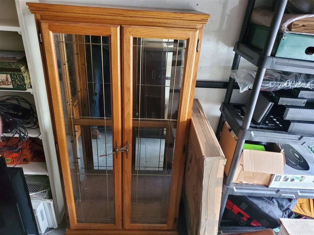 Tall glass cabinet With wooden shelves - Most Items have not been tested - Viewing Recommended- 17% Buyer Fee. Payment Processed through Live Auction World ( Visa or Master Card ) pick up Wednesday