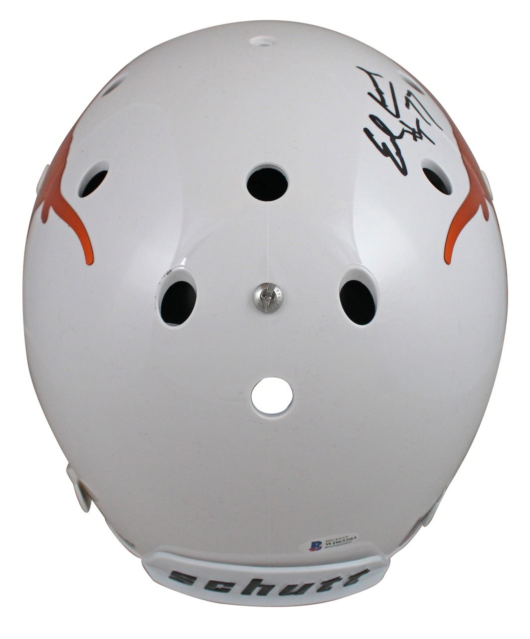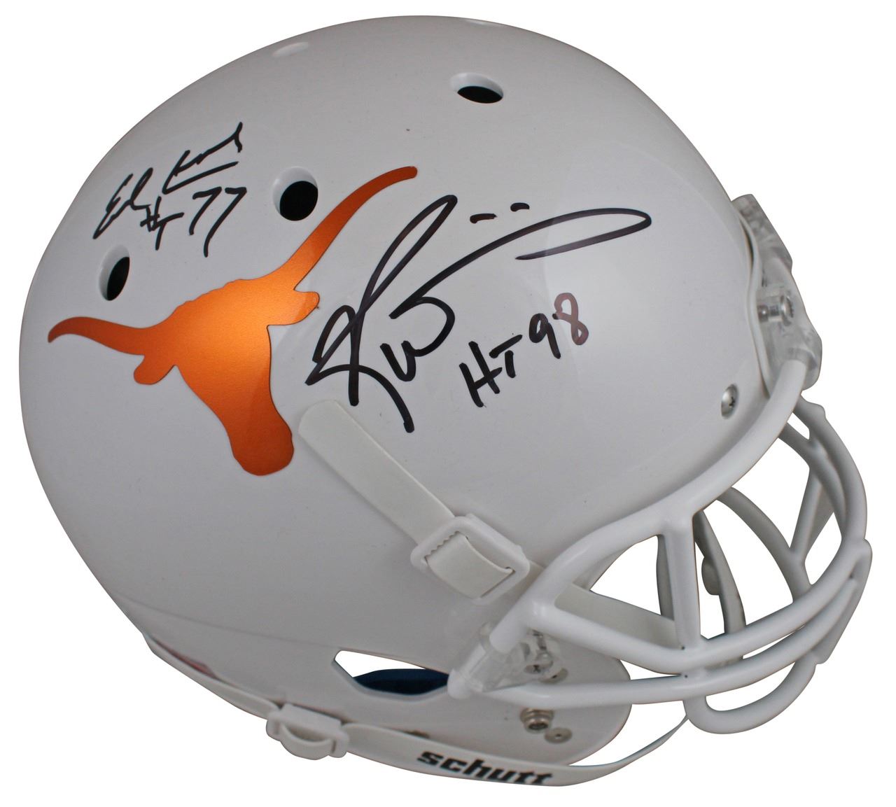 This Autographed w/ Chrome Decal Schutt Full Size Rep Helmet with the inscription of "HT '77 (Campbell) HT '98 (Williams)" has been Personally Signed by Earl Campbell & Ricky Williams of the Texas Longhorns. This item is 100% Authentic to include a Certificate of Authenticity (COA) / hologram by Beckett Authentication Services. This is a BAS Witnessed Protection Program item which means a Beckett Authentication Service representative was present when this item was being signed.