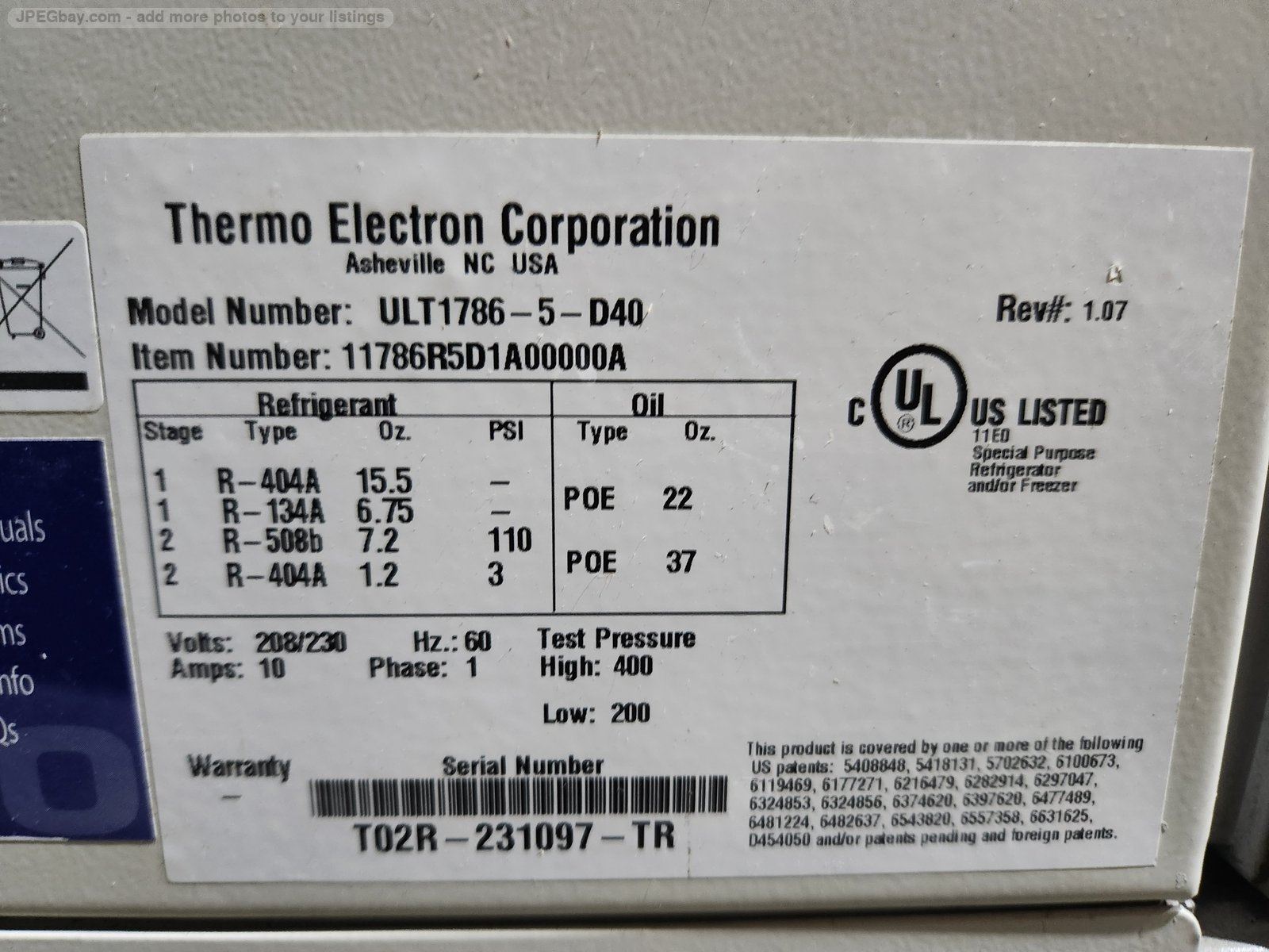 208/230 Volt 10 Amp 60Hz Phase 1. Freezer powers on and gets cold. No further extensive testing has been done. The seal may need to be adjusted/replaced as it does not sit tight. Sold As is.