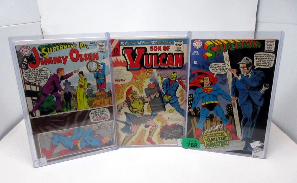 "Superman #209", "Son of Vulcan #49" and "Sper Man's Pal Jimmy Olsen #112". In acid proof protective sleeves.