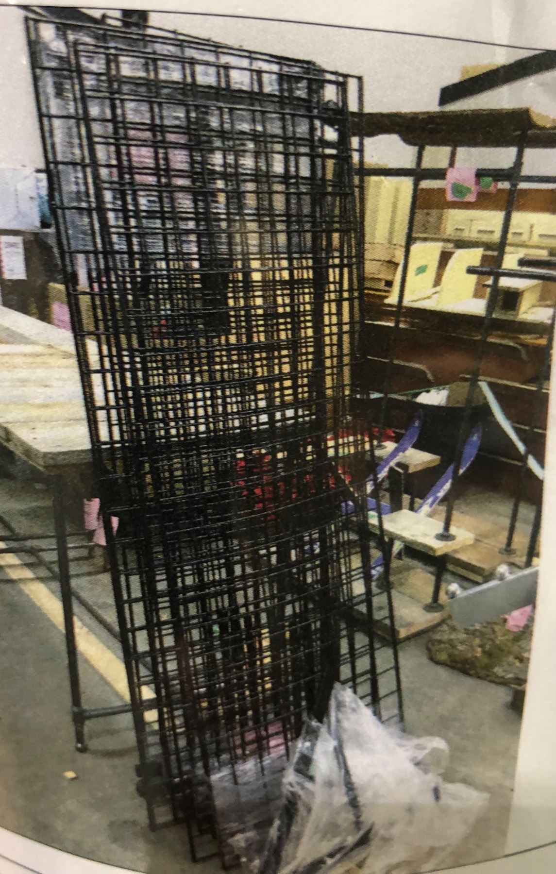 Three black metal grid racks w/ wheels & two black metal pedestal table stands from the love showÊ