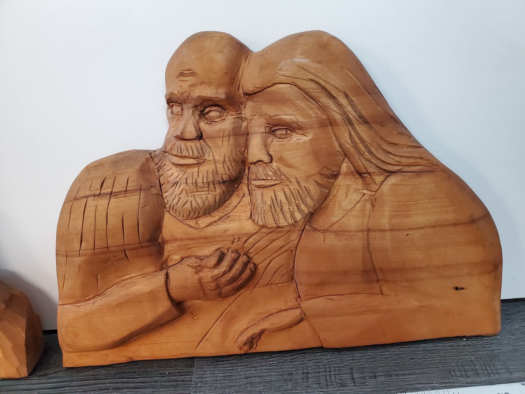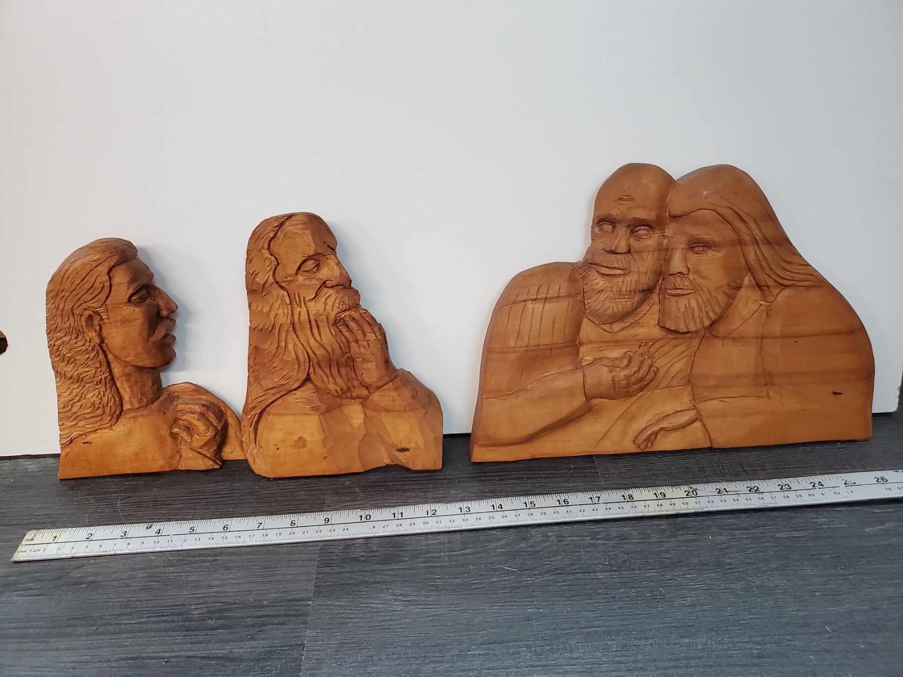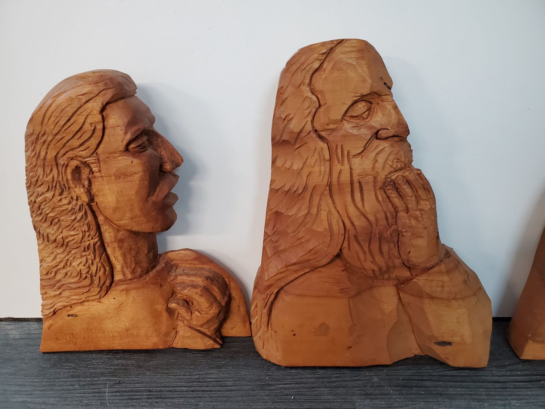 World Famous Signed Paul Bourbeau Carving -- Three carving of Heads -- -- 17% Buyer Fee. Payment Processed through Live Auction World Sdaturday @ 11:15 ( Visa or Master Card ) pick up Saturday Before 3:00, or Tuesday 9:30 till 5:07