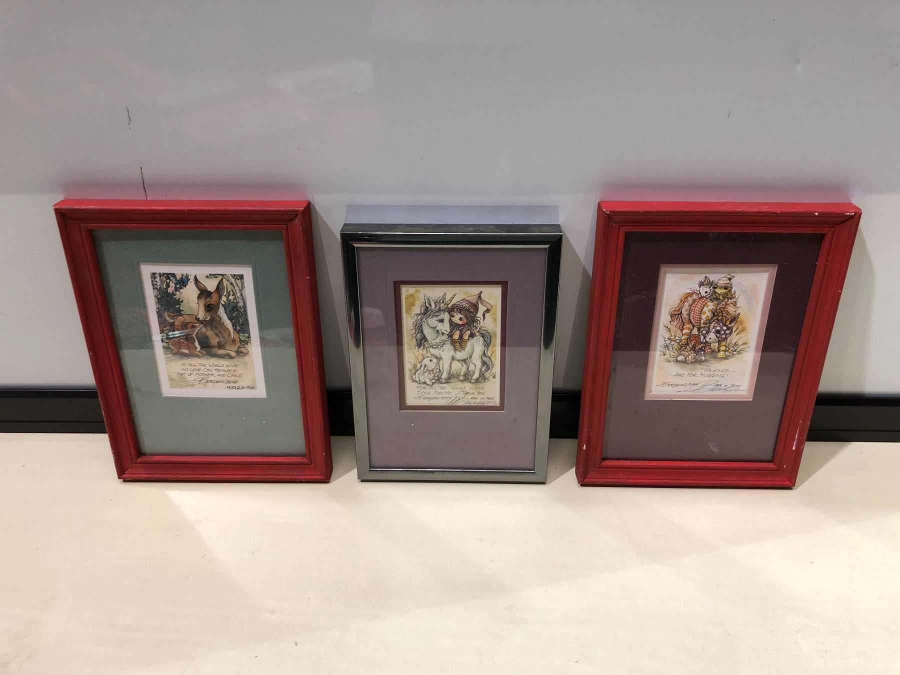 Three framed nursery rhyme style art collectables signed by artist with certificate of authenticity signed by Jody Bergsma (each measures 6" x 8")