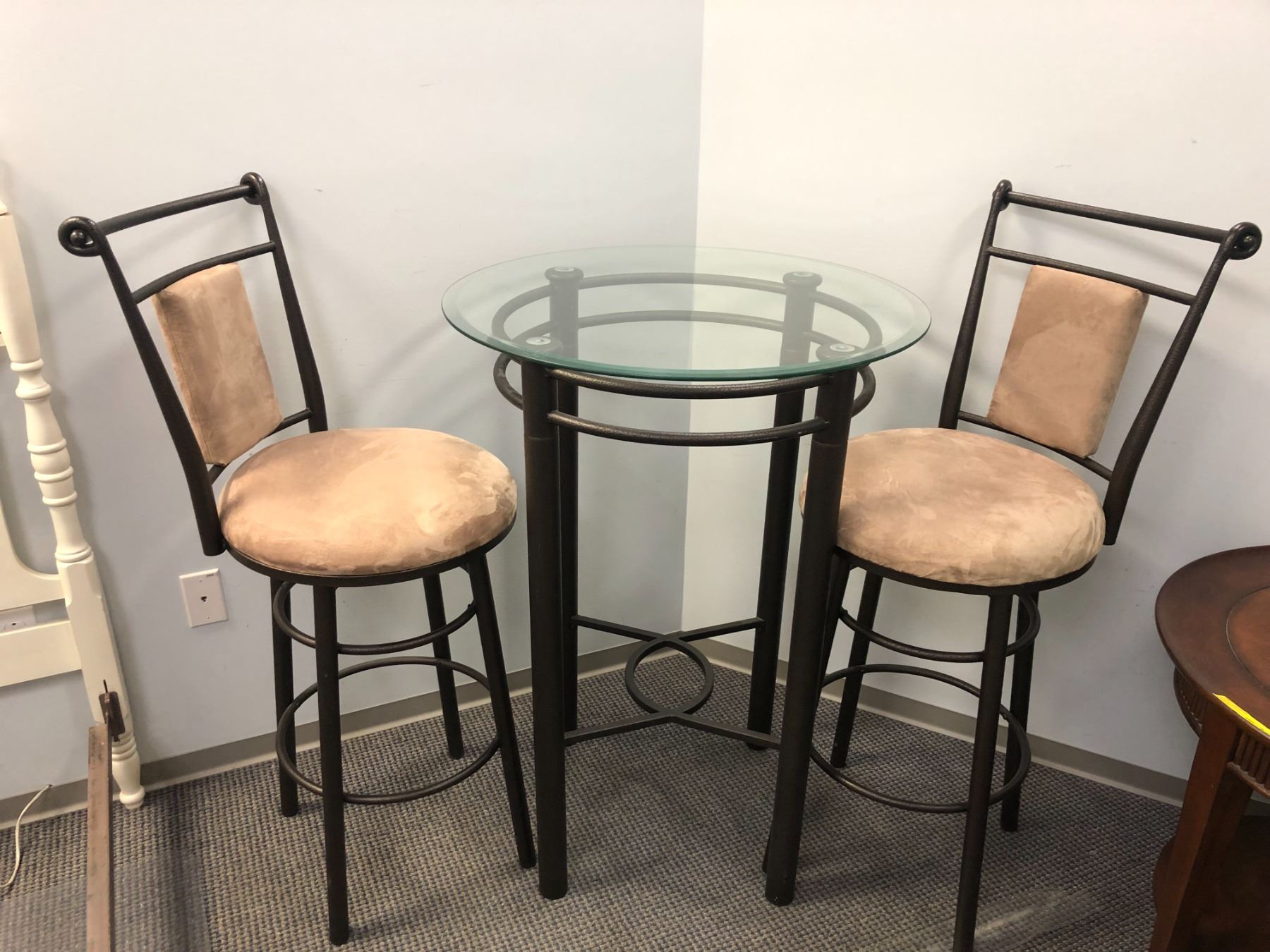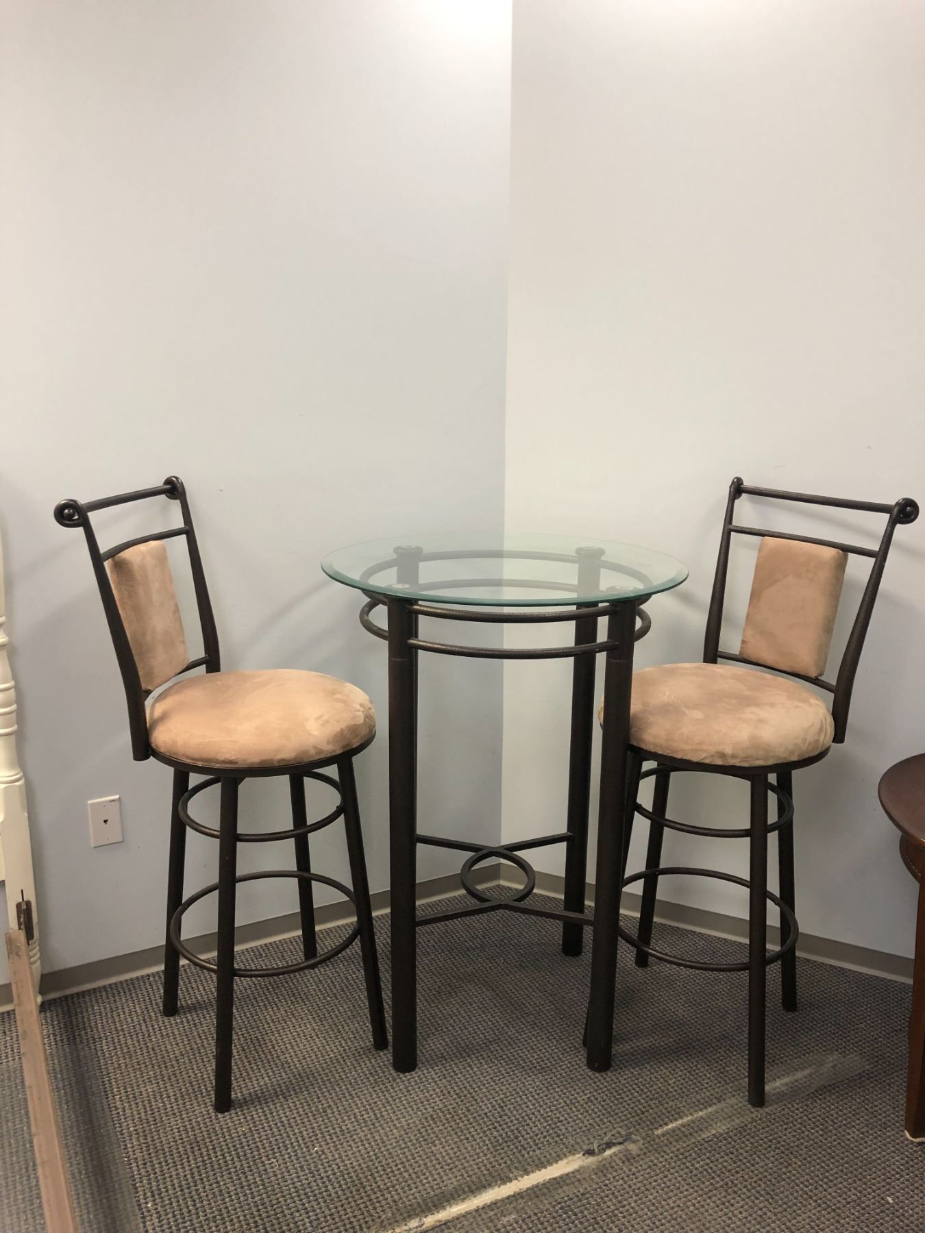 Three pc. bistro style glass top table w/ 2 matching chairs