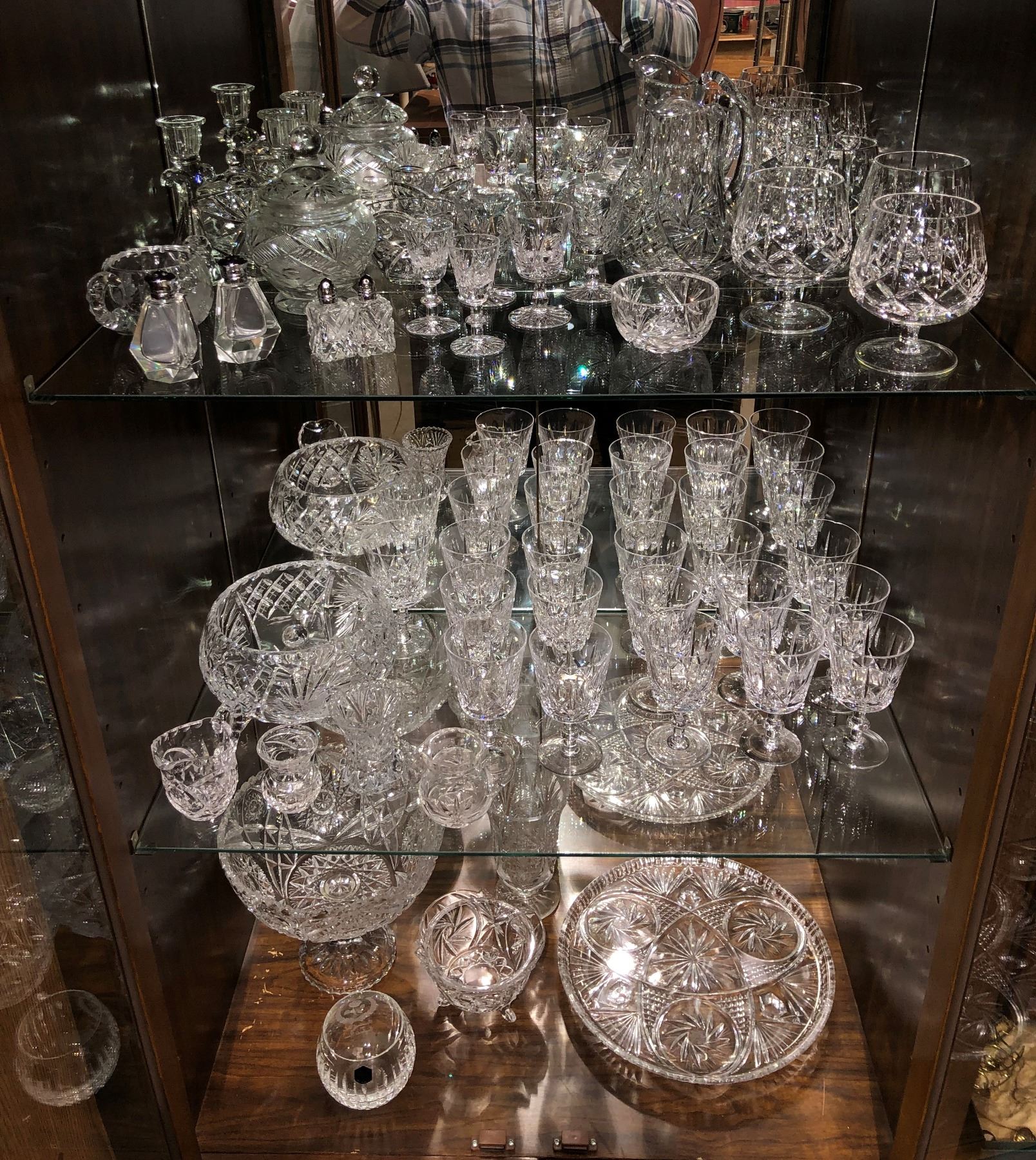 Three shelves of assorted crystalware pcs. - stemware/ bowls/ plates/ pitcher/ vase etc. - 47 pcs.