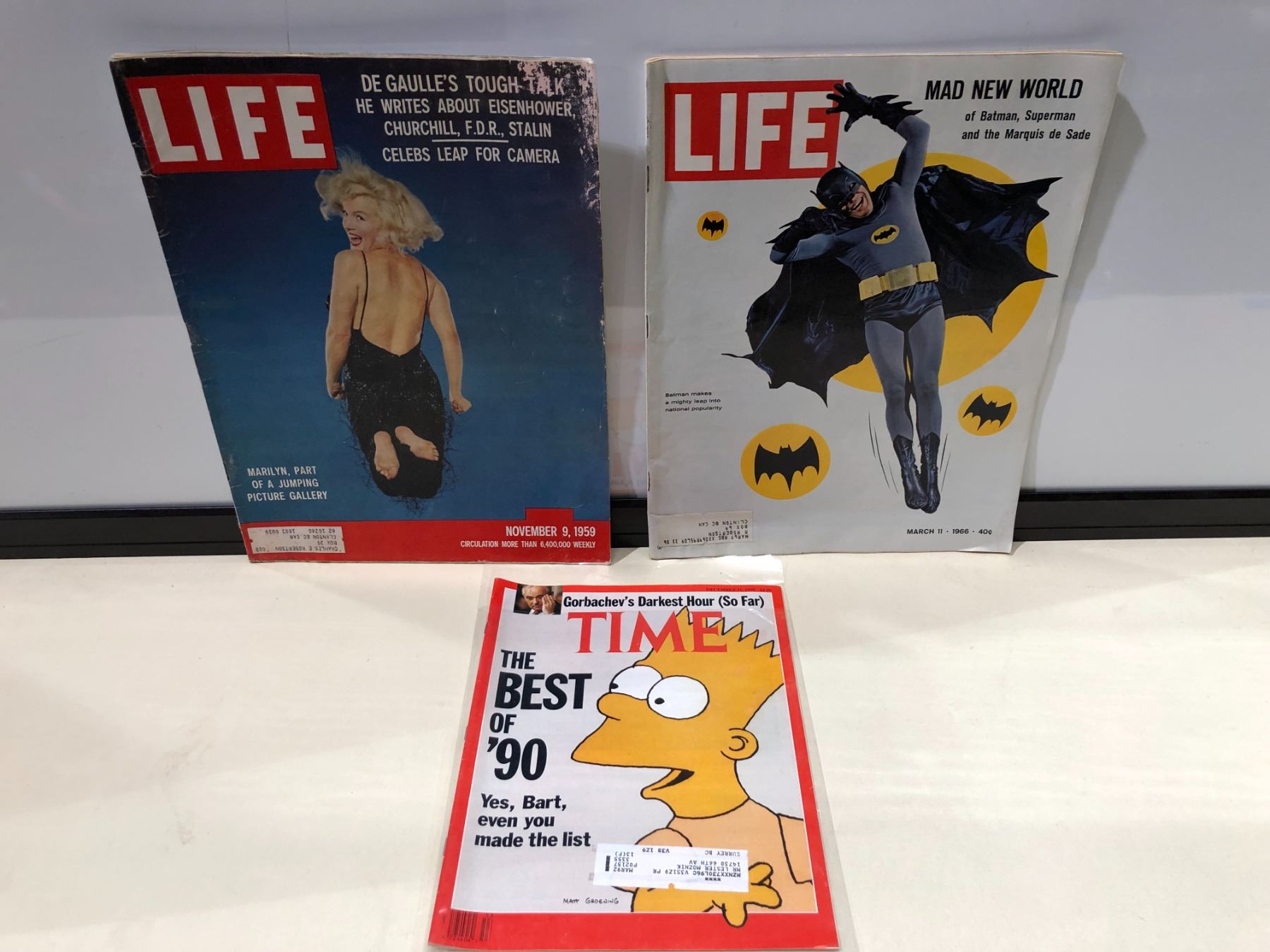 Three vintage collectable magazines - Life Nov. 9th 1959 Marilyn Monroe/Life March 11 1966 Mad new world of Batman & Time magazine Nov. 31st 1990 the best of the 90's)