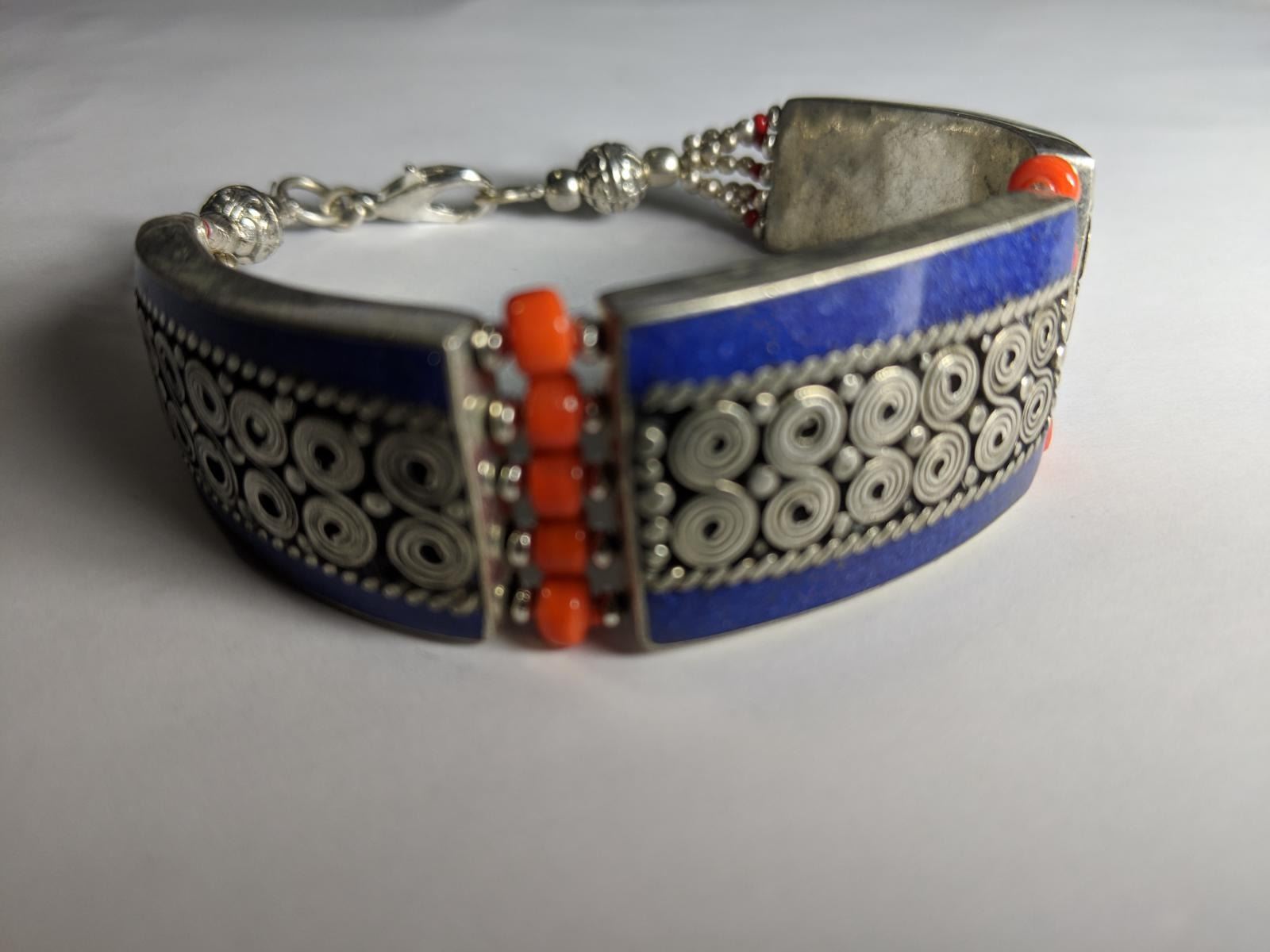 Tibet Natural Stone Hand Made lapiz lazuli Bracelet.......This elegant large Bracelet was handcrafted in Tibet, the home of exquisite jewelry craftsmanship. It was skillfully made with natural Lapiz Lazuli, each in a deep Tibetan Silver setting. and balance the design perfectly. Turquoise is used virtually worldwide for jewelry making, and is highly prized for its brilliant colors, which vary from mine to mine. The distinctive webbing patterns and variations of color in the stones .”””Note- All stones in this Bracelet are Natural.....Guaranteed....Vintage look but Bracelet is brand new.