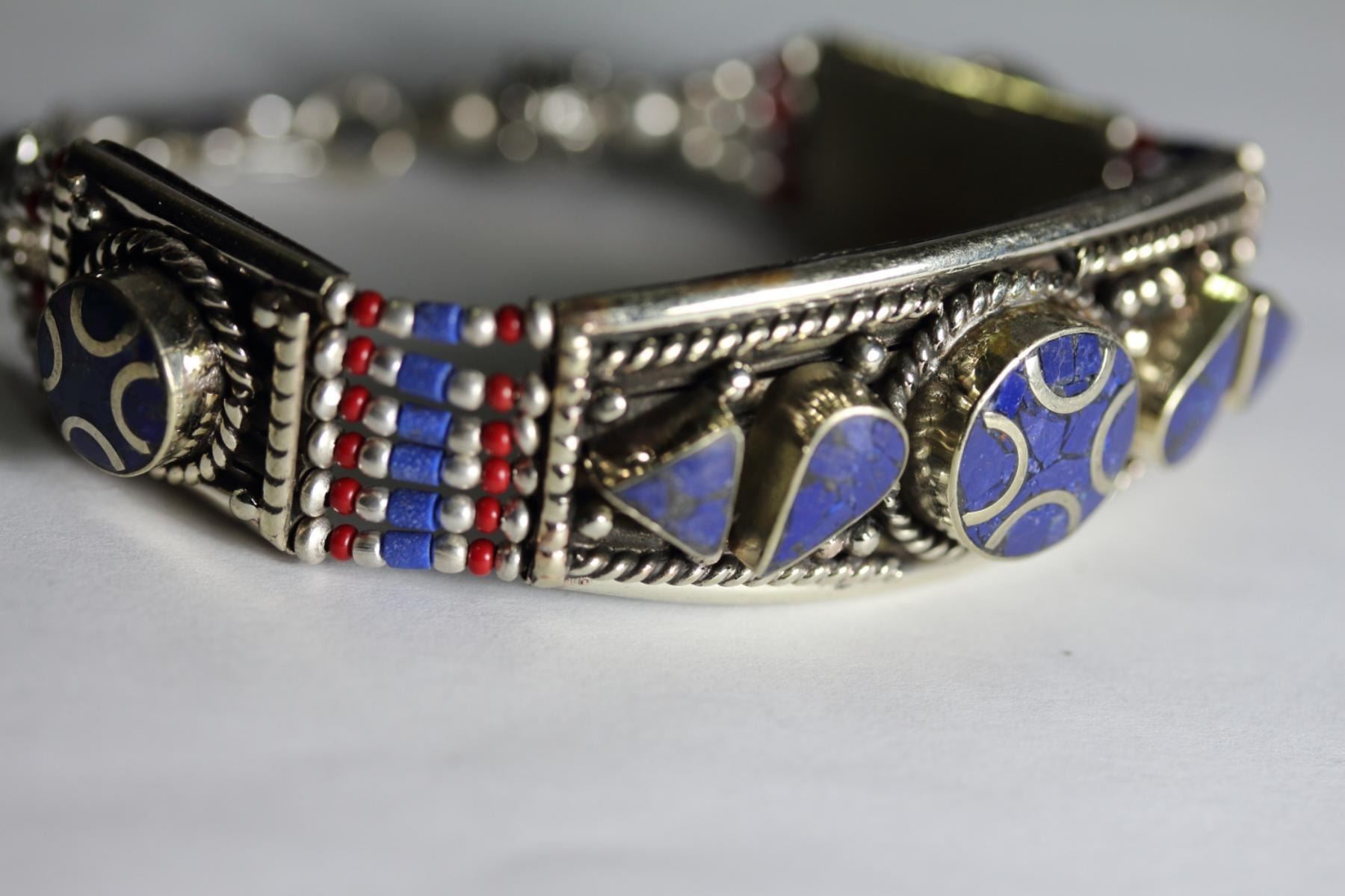 Tibet Natural Stone Hand Made lapiz lazuli Bracelet.......This elegant large Bracelet was handcrafted in Tibet, the home of exquisite jewelry craftsmanship. It was skillfully made with natural Lapiz Lazuli, each in a deep Tibetan Silver setting. and balance the design perfectly. Turquoise is used virtually worldwide for jewelry making, and is highly prized for its brilliant colors, which vary from mine to mine. The distinctive webbing patterns and variations of color in the stones .”””Note- All stones in this Bracelet are Natural.....Guaranteed....Vintage look but Bracelet is brand new.