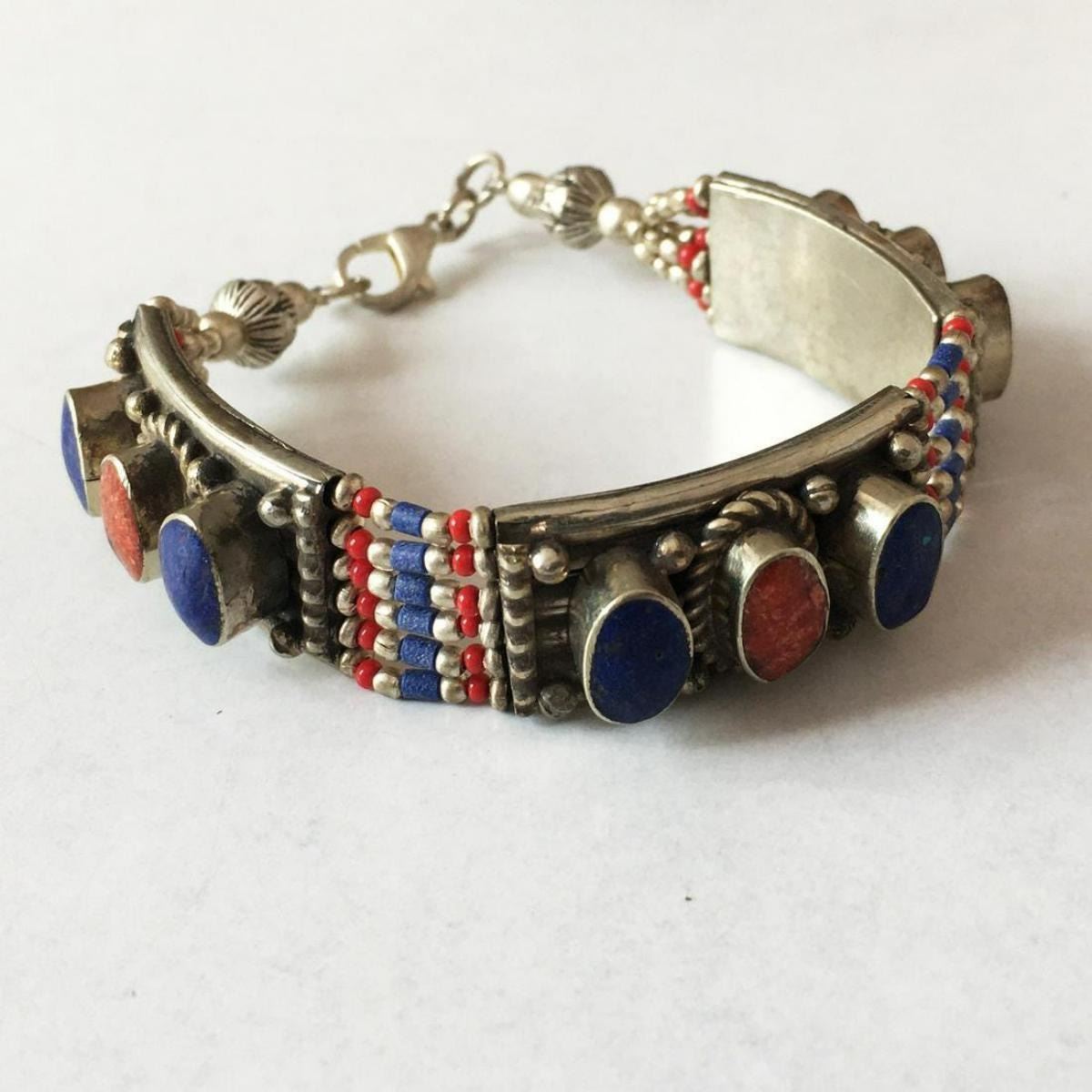Tibet Natural Stone Hand Made lapiz lazuli Bracelet.......This elegant large Bracelet was handcrafted in Tibet, the home of exquisite jewelry craftsmanship. It was skillfully made with natural Lapiz Lazuli, each in a deep Tibetan Silver setting. and balance the design perfectly. The distinctive webbing patterns and variations of color in the stones .”””Note- All stones in this Bracelet are Natural.....Guaranteed....Vintage look but Bracelet is brand new.