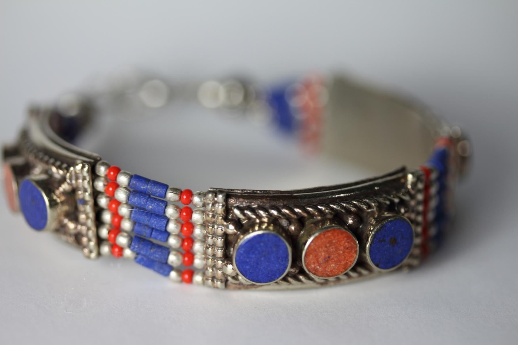 Tibet Hand Made lapiz lazuli Bracelet.......This elegant large Bracelet was handcrafted in Tibet, the home of exquisite jewelry craftsmanship. It was skillfully made with natural Lapiz Lazuli, each in a deep Tibetan Silver setting. and balance the design perfectly. Turquoise is used virtually worldwide for jewelry making, and is highly prized for its brilliant colors, which vary from mine to mine. The distinctive webbing patterns and variations of color in the stones .”””Note- All stones in this Bracelet are Natural.....Guaranteed....Vintage look but Bracelet is brand new.