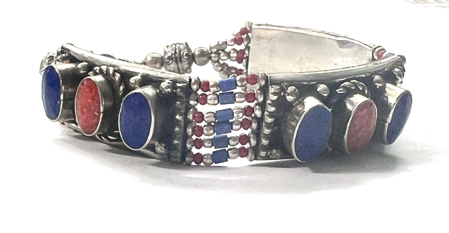 Hand Made lapiz lazuli Bracelet.......This elegant large Bracelet was handcrafted in Tibet, the home of exquisite jewelry craftsmanship. It was skillfully made with natural Lapiz Lazuli, each in a deep Tibetan Silver setting. and balance the design perfectly. Turquoise is used virtually worldwide for jewelry making, and is highly prized for its brilliant colors, which vary from mine to mine. The distinctive webbing patterns and variations of color in the stones .???Note- All stones in this Bracelet are Natural.....Guaranteed....Vintage look but Bracelet is brand new.