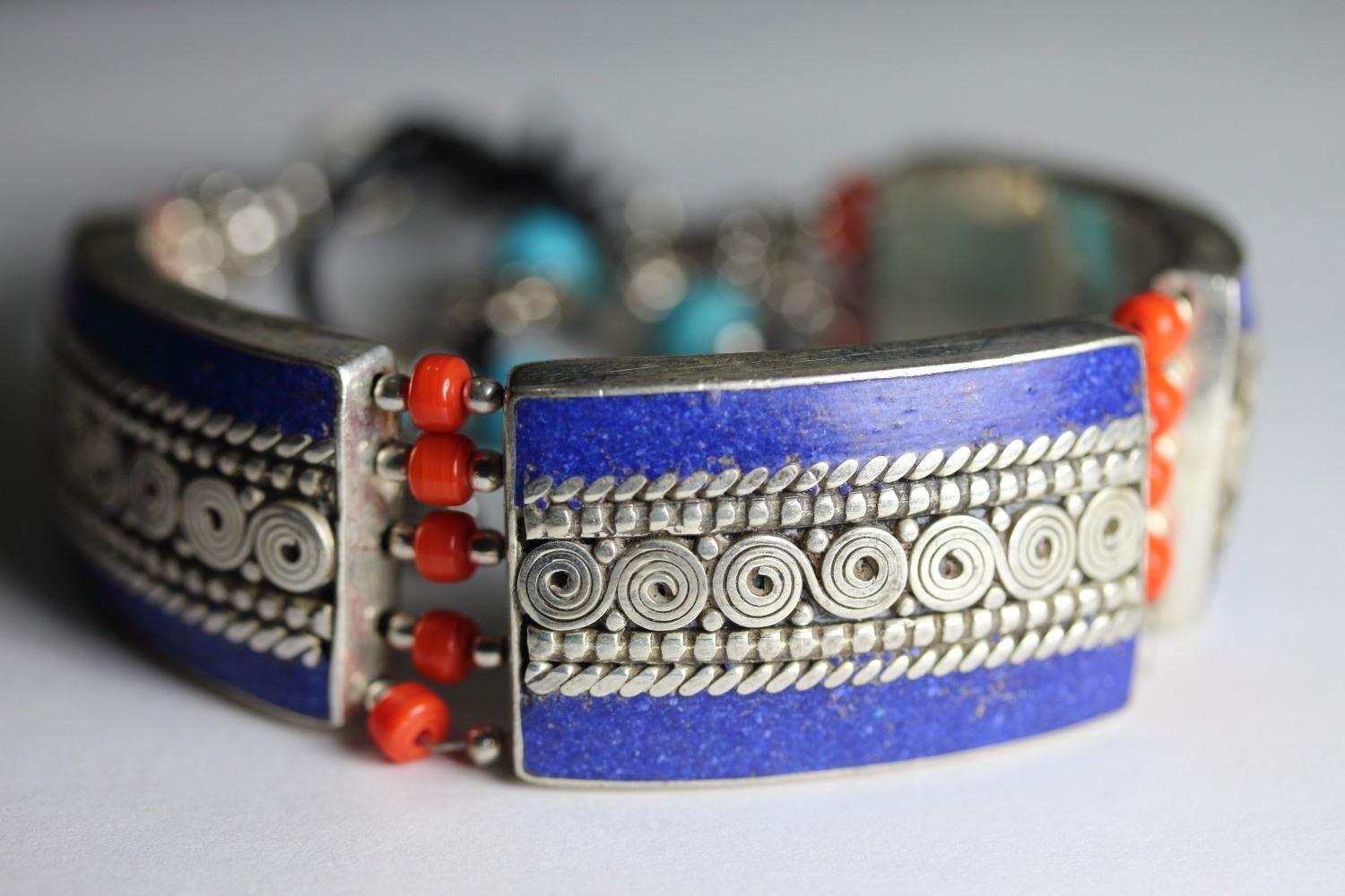 Tibet Natural Stone Hand Made lapiz lazuli, Coral Bracelet.......This elegant large Bracelet was handcrafted in Tibet, the home of exquisite jewelry craftsmanship. It was skillfully made with natural coral, each in a deep Tibetan Silver setting. and balance the design perfectly. Turquoise is used virtually worldwide for jewelry making, and is highly prized for its brilliant colors, which vary from mine to mine. The distinctive webbing patterns and variations of color in the stones .Note- All stones in this Bracelet are Natural.....Guaranteed....Vintage look but Bracelet is brand new.