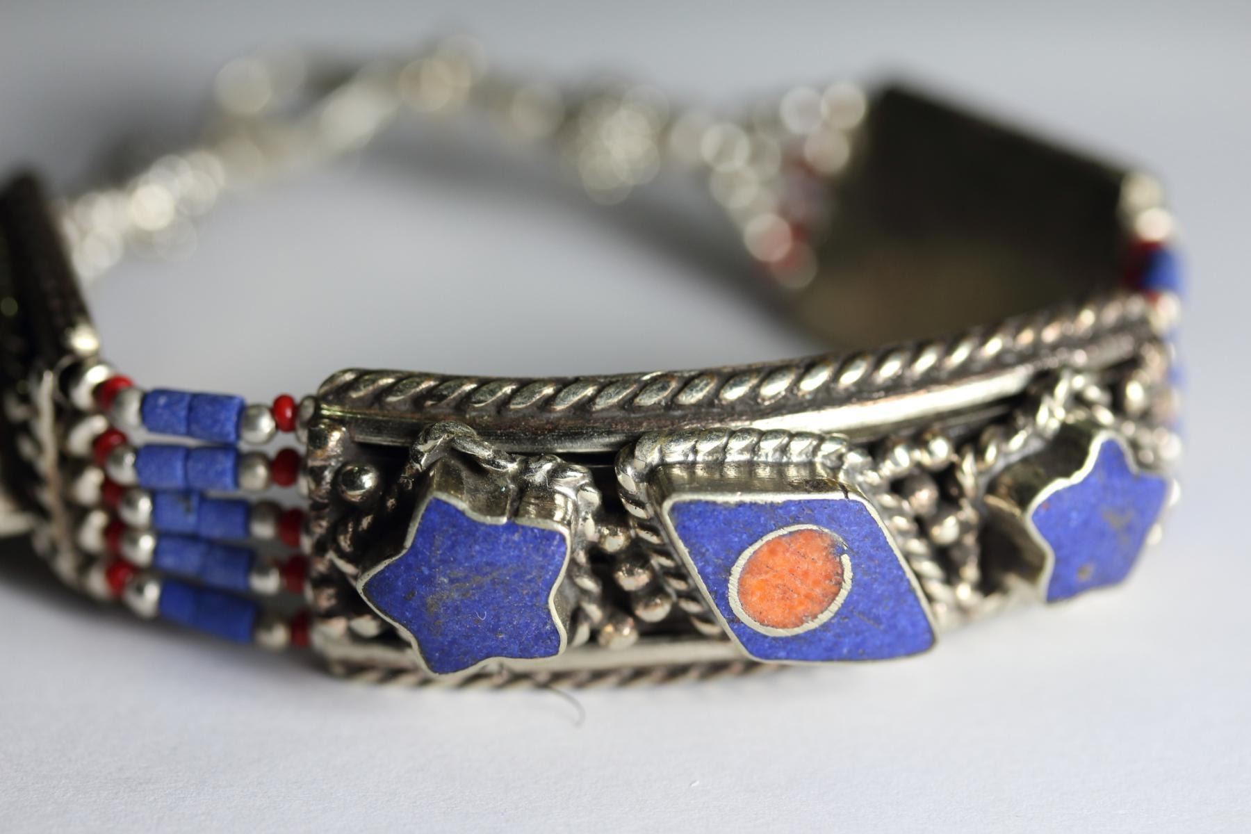 Tibet Natural Stone Hand Made lapiz lazuli, Coral Bracelet.......This elegant large Bracelet was handcrafted in Tibet, the home of exquisite jewelry craftsmanship. It was skillfully made with natural coral, each in a deep Tibetan Silver setting. and balance the design perfectly. Turquoise is used virtually worldwide for jewelry making, and is highly prized for its brilliant colors, which vary from mine to mine. The distinctive webbing patterns and variations of color in the stones .”””Note- All stones in this Bracelet are Natural.....Guaranteed....Vintage look but Bracelet is brand new.